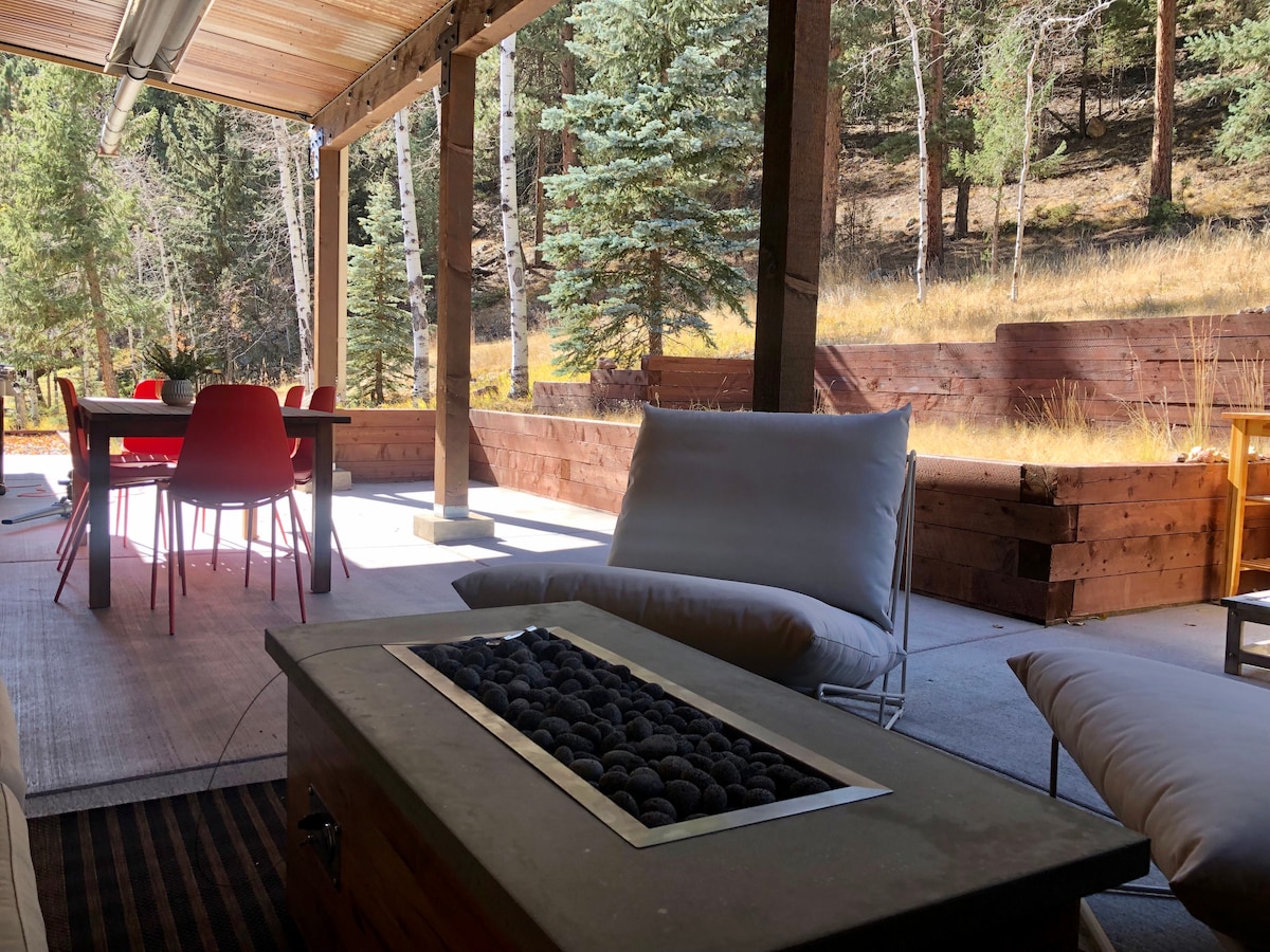 Retraite de montagne moderne avec des finitions luxueuses, des espaces de divertissement, et elle est familiale. Peut accueillir jusqu'à 4 personnes avec 3 lits, 2 chambres et 2 salles de bain. Comprend un jacuzzi, une douche à vapeur, un barbecue au gaz, une cheminée, un patio couvert avec un chauffage, une cuisine de chef, un parking, la faune, + une oasis de forêt privée dans l'arrière-cour. Accès facile. À environ une heure de Denver, 1h15 de l'aéroport, à proximité des sentiers, des parcs et des lacs. Pas de fêtes, pas d'animaux de compagnie, pas de tabac et une limite de 8 personnes au total (y compris les visiteurs).