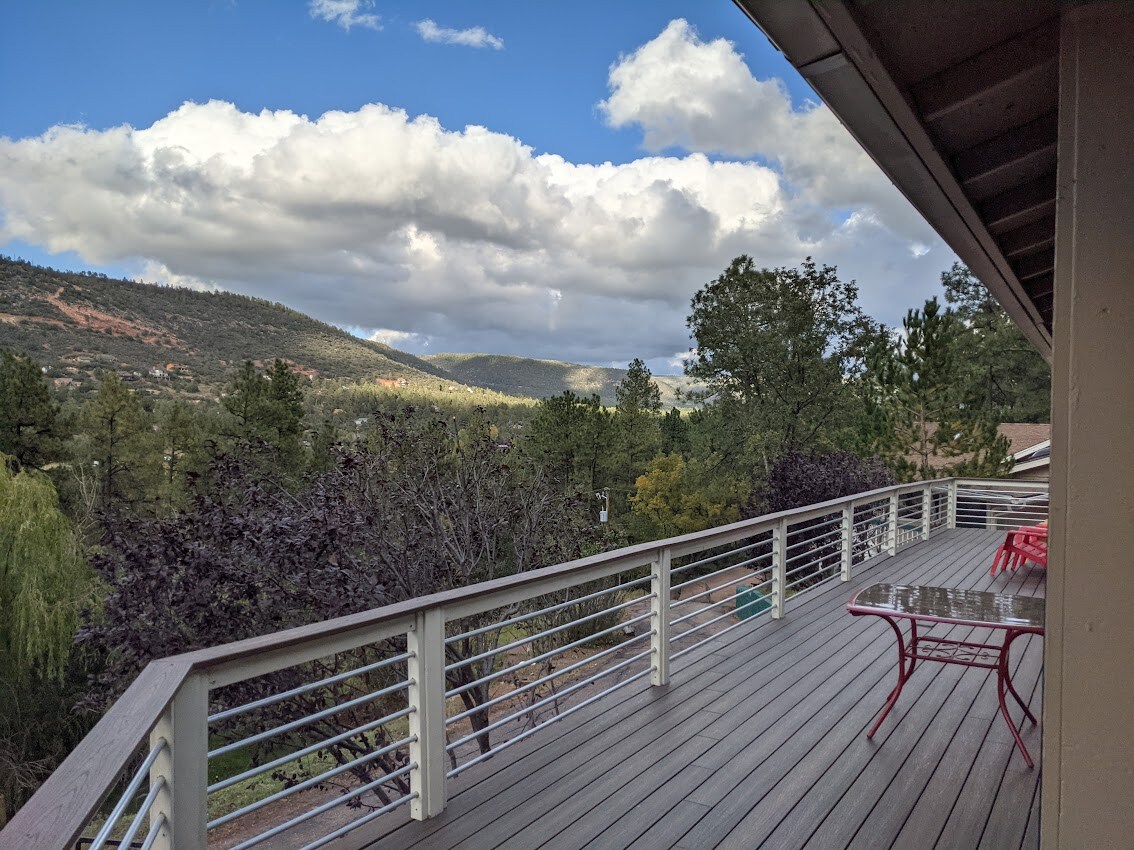 Cabane moderne, magnifiquement conçue et spacieuse de 2 chambres/2 salles de bain de plain-pied dans une communauté fermée haut de gamme. Situé sur le flanc de la montagne avec des vues incroyables tout autour. La maison est située dans un cul-de-sac isolé, avec des collines vallonnées pavées pour la marche/le vélo ou les excursions touristiques. Faites une randonnée jusqu'au sommet de Ruin Hill où vous pourrez voir des ruines amérindiennes ou asseyez-vous dans le patio arrière et profitez des visiteurs wapitis. À seulement 1 h 45 de la région de Phoenix, chargeur VE de niveau 2 (50 A) sur place. Généralement 20 degrés de moins que la région de Phoenix.