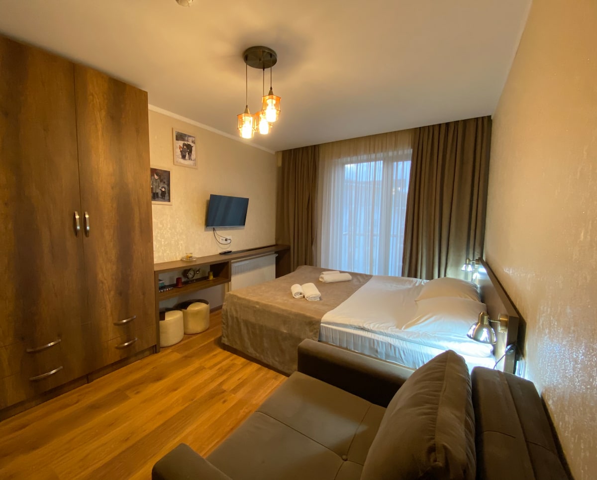 Ce studio moderne situé au centre est idéal pour 3 personnes, de préférence 2 adultes et un enfant. Le studio est équipé de tous les équipements nécessaires à votre confort et à votre commodité. Il est situé sur le territoire hôtelier offrant une sécurité supplémentaire. Parking inclus. Le studio comprend le cloisonnement, la connexion Wi-Fi gratuite, le balcon meublé et bien plus. Voir la liste complète sous les détails du logement. Les environs comprennent la forêt, l'aire de jeux extérieure pour enfants et les pistes cyclables. Ce studio est également proche de Koxta Gora.