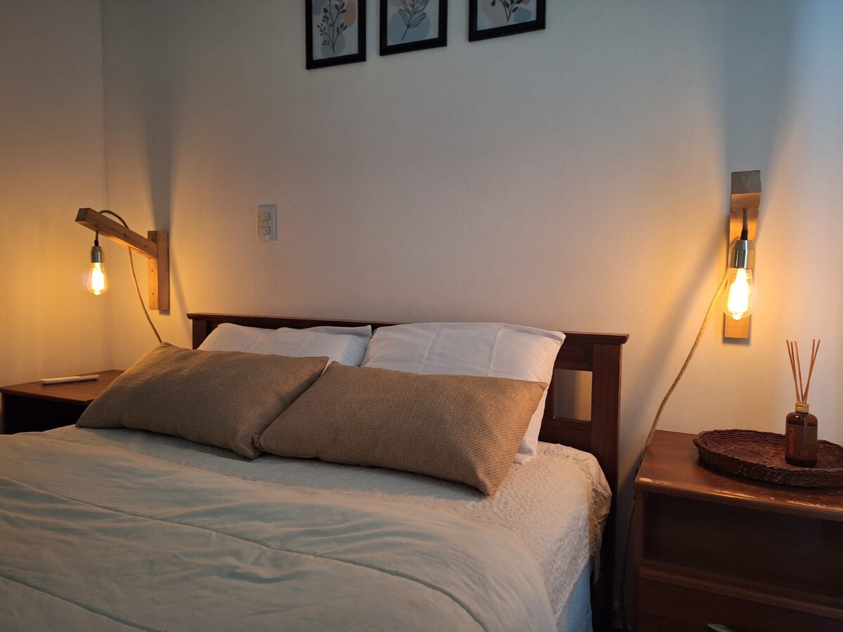 Appartement moderne de catégorie très spacieux et lumineux au premier étage. Excellent emplacement dans un quartier résidentiel, sûr et calme. Idéal pour travailler ou se reposer. Il est situé à proximité d'espaces verts, à quelques mètres de la place « La Cruz » et à 3 pâtés de maisons de la colline « El Triunfo ». La chambre dispose d'un sommier 2 places, d'une télévision avec S-Mart TV, d'un placard et d'un balcon donnant sur la rue. La salle à manger dispose d'un canapé-lit, d'une table et de chaises modernes, d'une télévision S-Mart TV de 50^, d'un bar à petit-déjeuner et d'une sortie sur une terrasse
