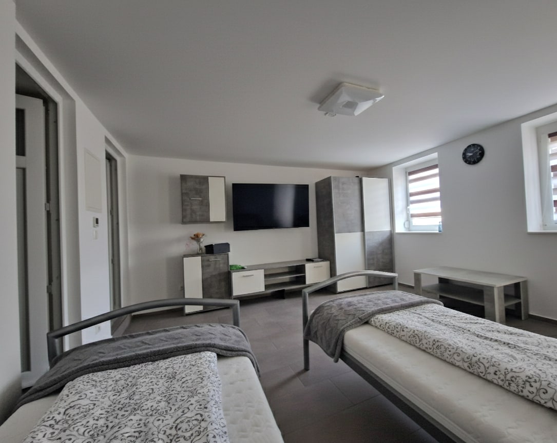 Notre appartement de vacances rénové est meublé avec amour et comprend environ 65 m². Il est au 1er étage de notre maison, dans un quartier résidentiel calme. Il dispose de 2 chambres avec lits doubles (1x190/200 ; 1x140/200), salon-salle à manger, cuisine (entièrement équipée), douche, WC, balcon, télévision par satellite, système de musique, WLAN, lit bébé et chaise haute. Places de parking à proximité. MERCI DE NOTER : Si deux invités occupent les deux chambres, nous facturons un supplément de 12 € par nuit.