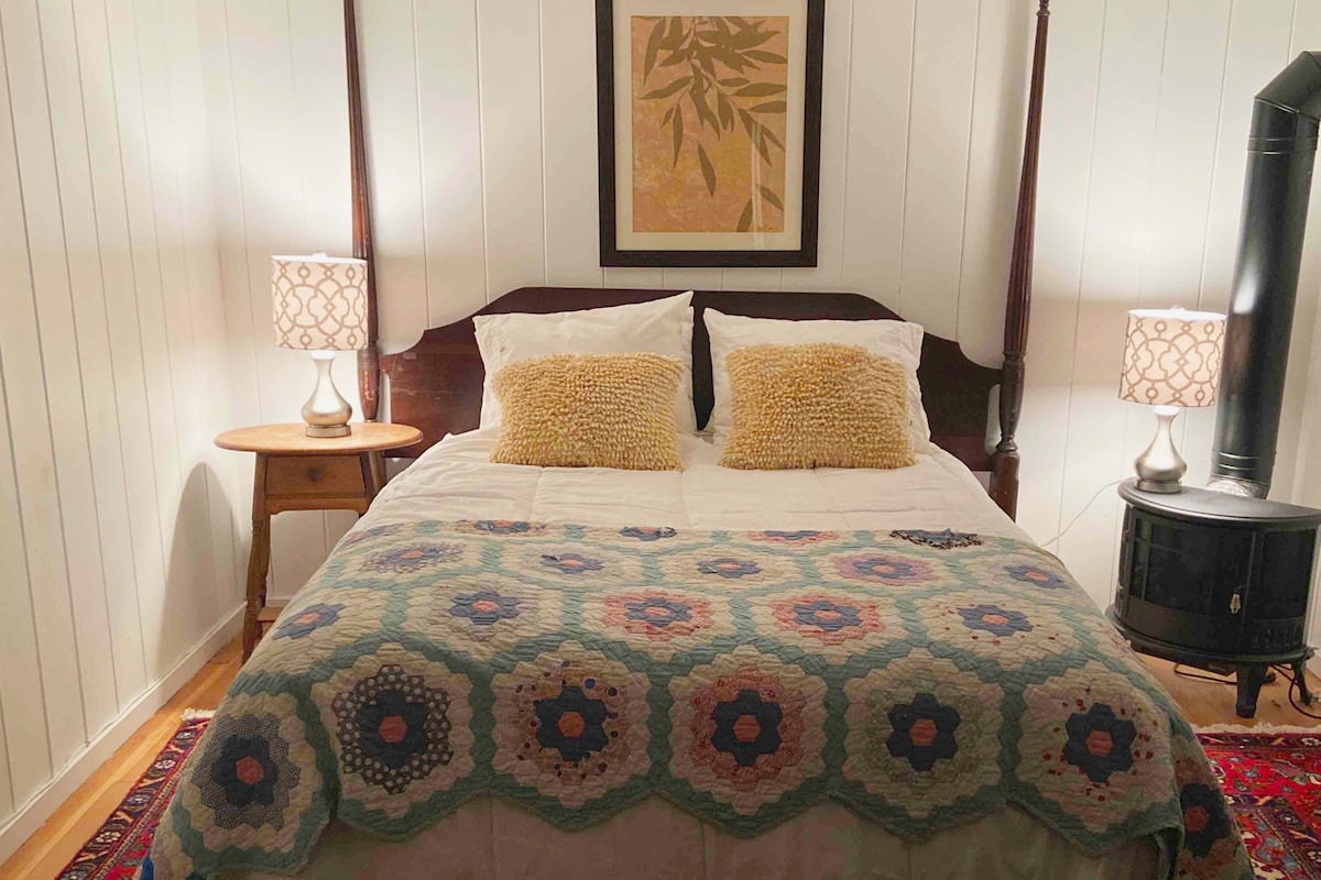 A wall of windows lets the sun shine in on your cozy private room. Private bathroom complete with heated floors and tub (+shower). Kitchen equipped with coffee/tea, plates, silverware, cups, sink, microwave and mini-fridge. There is a table and chairs to work/eat. We follow all the updated cleaning protocols. We are both fully vaccinated and require all guests to be, too.