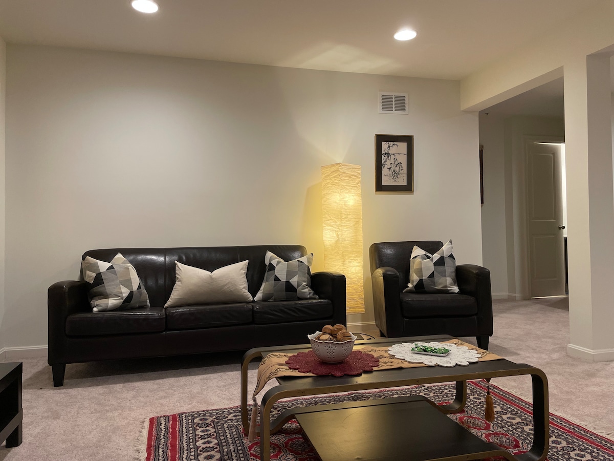 Il s'agit d'un niveau inférieur spacieux d'une maison nouvellement construite. Cet espace invité privé dispose d'un salon, d'un coin repas et d'une kitchenette en plus d'une chambre et d'une salle de bain. Les voyageurs ne partagent que l'entrée principale de la maison de ville avec les propriétaires qui vivent à l'étage. Cet espace privé décoré comprend une télévision connectée, des sièges confortables, une salle à manger pour 4 personnes, un four à micro-ondes, une cafetière, un réfrigérateur complet, un grille-pain/une friteuse à air, un lit Queen Size, une armoire et une commode. Lave-linge/sèche-linge disponible sur demande. Veuillez consulter le règlement intérieur avant de réserver.