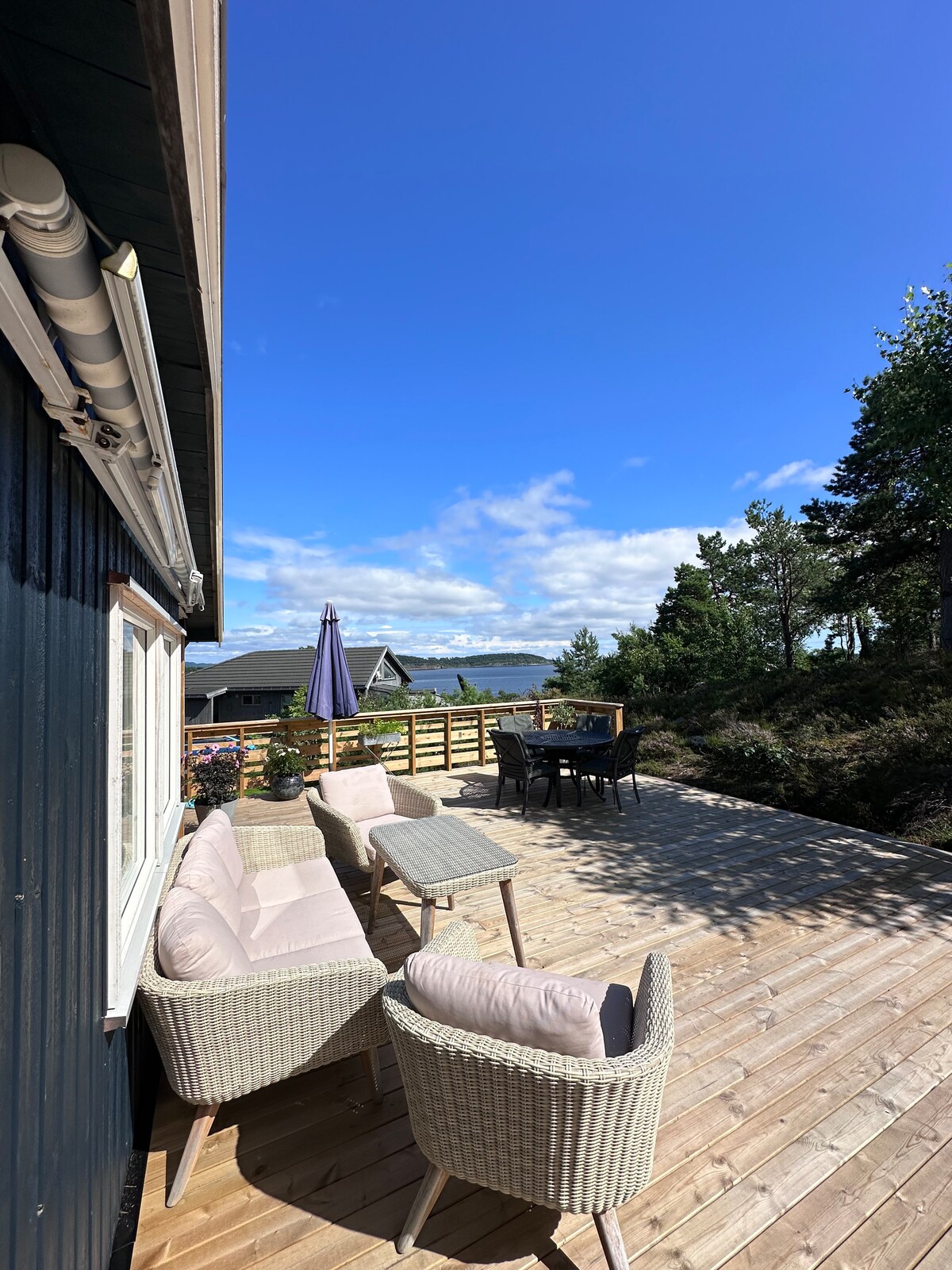 Familiehytte med sjøutsikt og stor uteplass