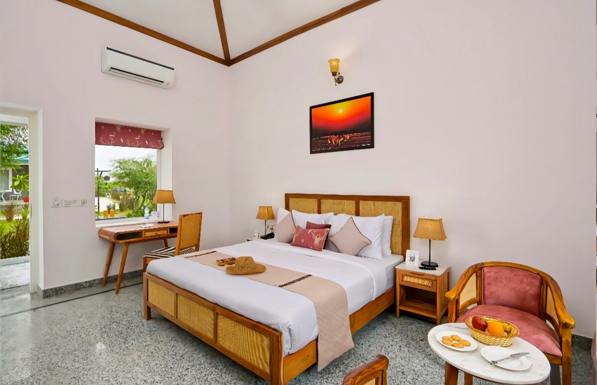Profitez de la beauté naturelle de cette ferme simple. Nos logements confortables et rustiques sont conçus pour se détendre. Choisissez parmi [type cottage/chambre] avec une vue imprenable sur la ferme, où vous pourrez profiter de soirées confortables au coin du feu ou de l'observation des étoiles sous le ciel ouvert. Idéal pour les familles, que vous soyez à la recherche d'une escapade romantique, d'une retraite de groupe ou d'une escapade en solo, le séjour à Kishan Jawai est la destination idéale pour renouer avec vos proches ou pour trouver la paix et la solitude.