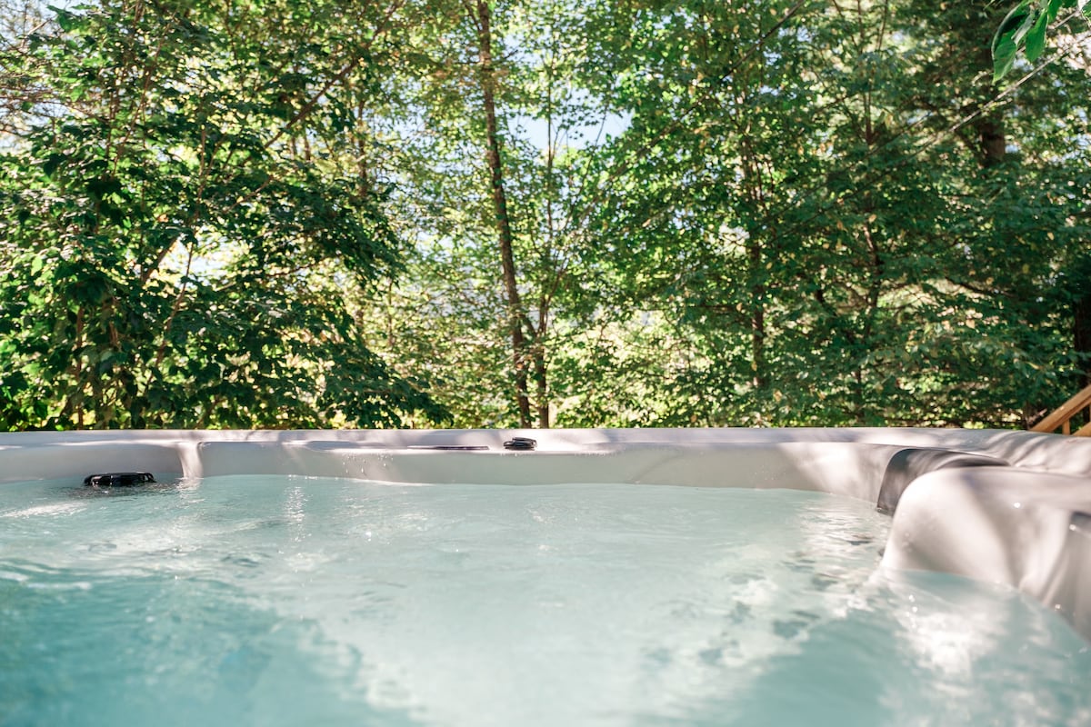 Restez au frais dans votre suite Cottage climatisée au premier étage avec une vue imprenable sur les crêtes du TN et de la NC ! Les caractéristiques comprennent 2 chambres, 1 salle de bain, une cheminée, une salle à manger, 3 entrées privées et un patio avec barbecue, foyer et bain à remous pour 3 personnes. Profitez également d'un jacuzzi de 2 mètres dans le hangar ! Partez en randonnée sur la ligne TN/NC ou explorez les gorges pour la baignade, l'escalade et l'aventure. Une escapade paisible en montagne vous attend !