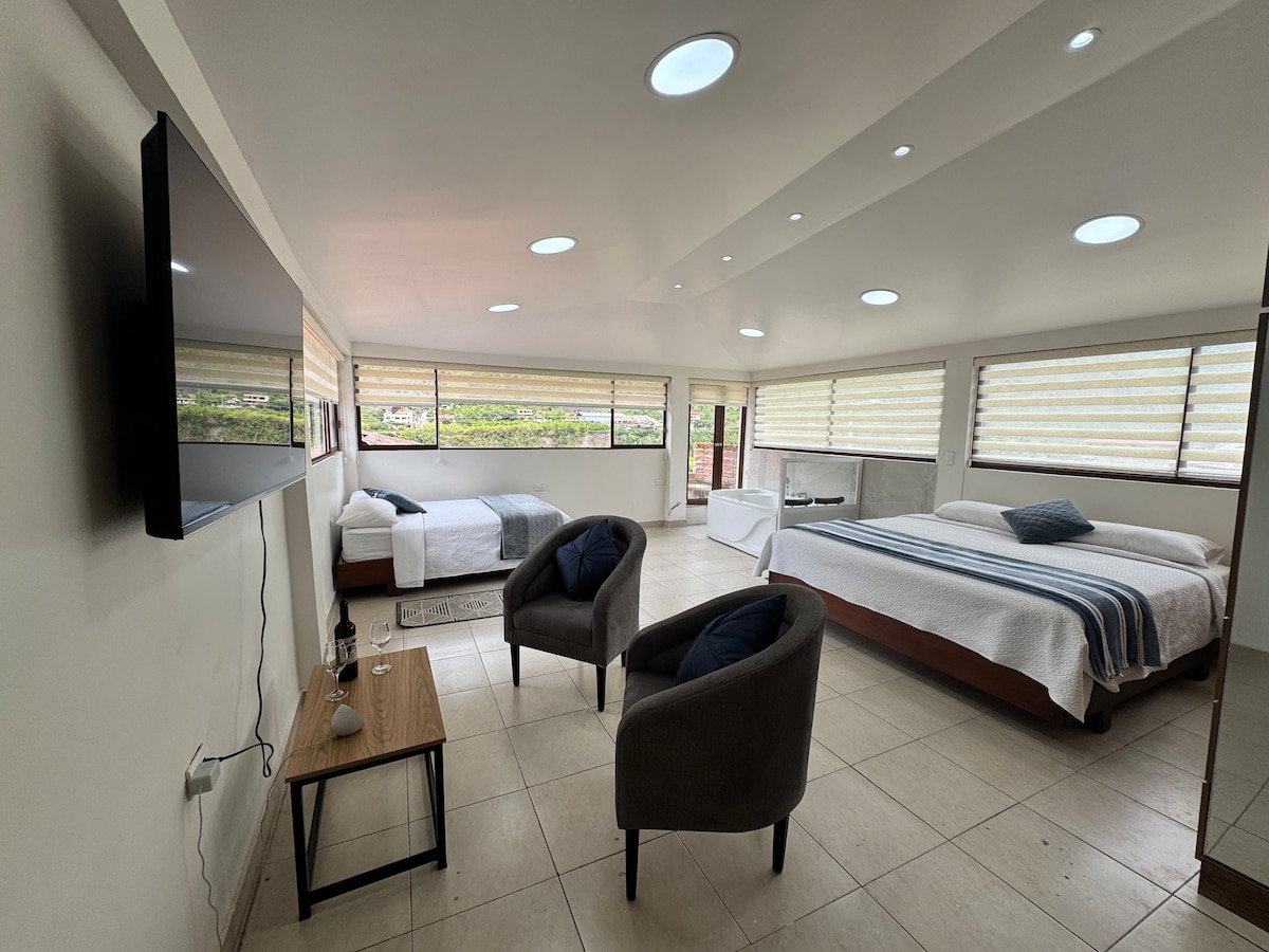 Cette suite spacieuse et calme se situe en plein centre de Baños. Le Wi-Fi est rapide ; la douche est chaude, et ils fonctionnent tous les deux pendant les coupures de courant. Il y a une grande chambre avec un lit queen size séparée du séjour par une cloison. Le salon/salle à manger dispose d'une cuisine complète, d'une table pour quatre personnes, d'un canapé-lit pouvant accueillir deux personnes supplémentaires. Il y a deux bureaux et une salle de bain privée à côté du salon avec une grande douche. Les petits animaux de compagnie sont les bienvenus avec autorisation. Il est interdit de fumer.