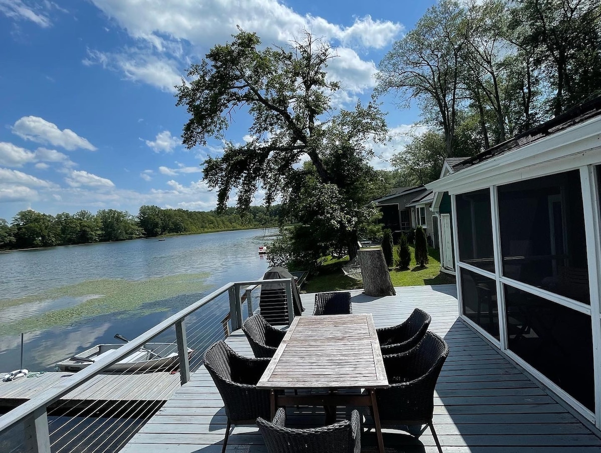 Au bord du lac, évadez-vous ! Excellent emplacement pour travailler depuis chez vous. Seulement 2 miles de l'auberge Candlewood et à moins de 2 miles de The Elephant' s Trunk Flea Market. Tarifs réduits pour les séjours de 4 semaines et plus. Préparez vos maillots de bain et venez séjourner dans notre maison en bord de lac. À 75 pieds de bord de lac privé, quai, patio au bord du lac, 2 kayaks et 2 planches de paddle. La maison a été entièrement rénovée en 2017 et offre tout le confort d'un chez-soi. Apportez votre bateau ou jet skis et profitez de notre quai privé.