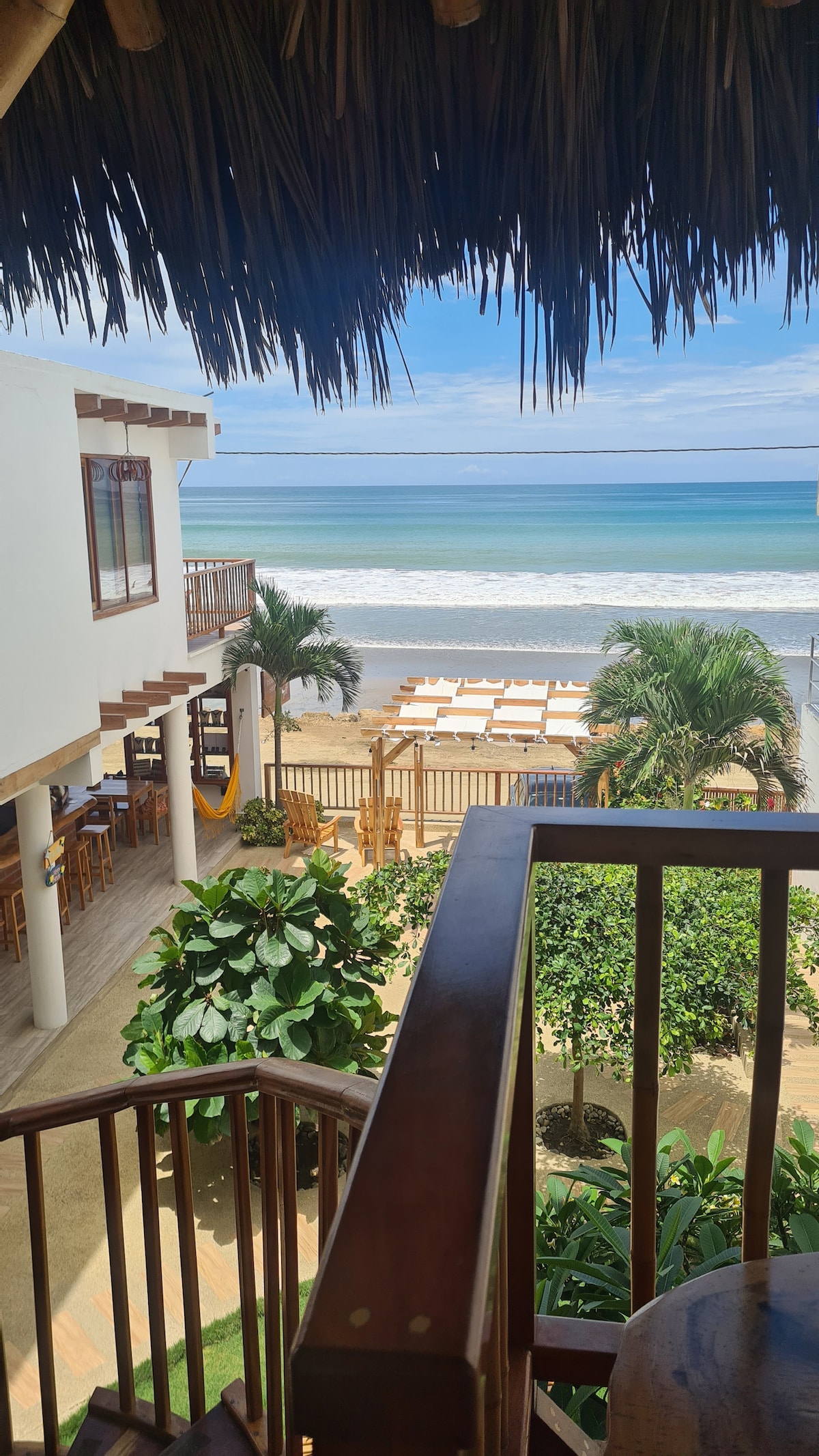 Disfruta de una vista al mar desde tu balcón privado en nuestra acogedora suite familiar con dos camas queen y un sofa cama adicional, perfectamente ubicada a solo unos pasos del Mall del Pacífico y de la popular Playa El Murciélago, tendrás todo lo que necesitas cerca. Además contamos con seguridad privada, garaje y parqueadero.