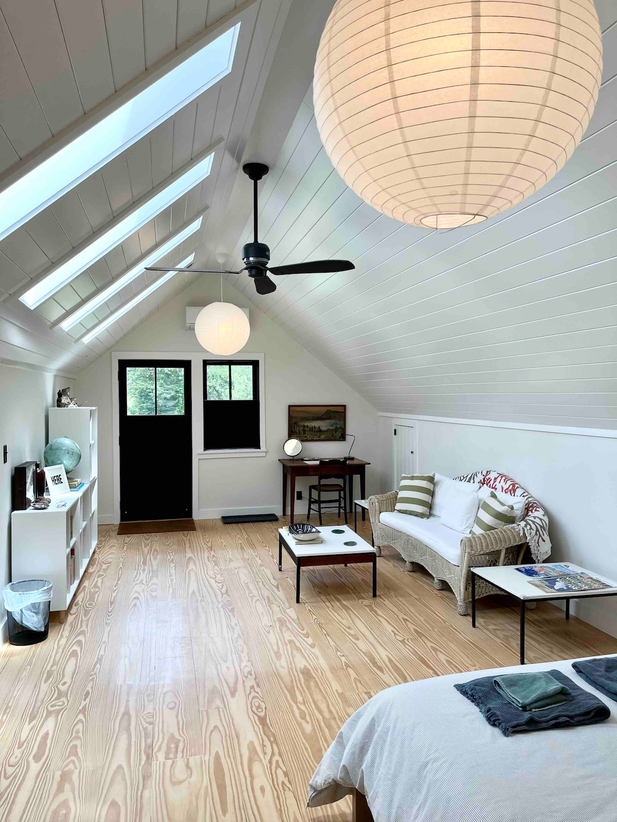 Une belle suite sur Martha's Vineyard avec une entrée privée au 2e étage de l'aile arrière de notre grange moderne récemment rénovée. Entourée d'arbres, à côté d'une grande prairie, cette grande suite de 400 pieds carrés dispose de plafonds voûtés en bois et de puits de lumière. Profitez de la douche extérieure et du nouveau coin salon extérieur. L'emplacement est situé au centre, juste à côté de l'historique Music St, à quelques pas d'un petit centre-ville qui offre des commodités. Renseignez-vous sur notre autre suite si vous êtes avec d'autres personnes.