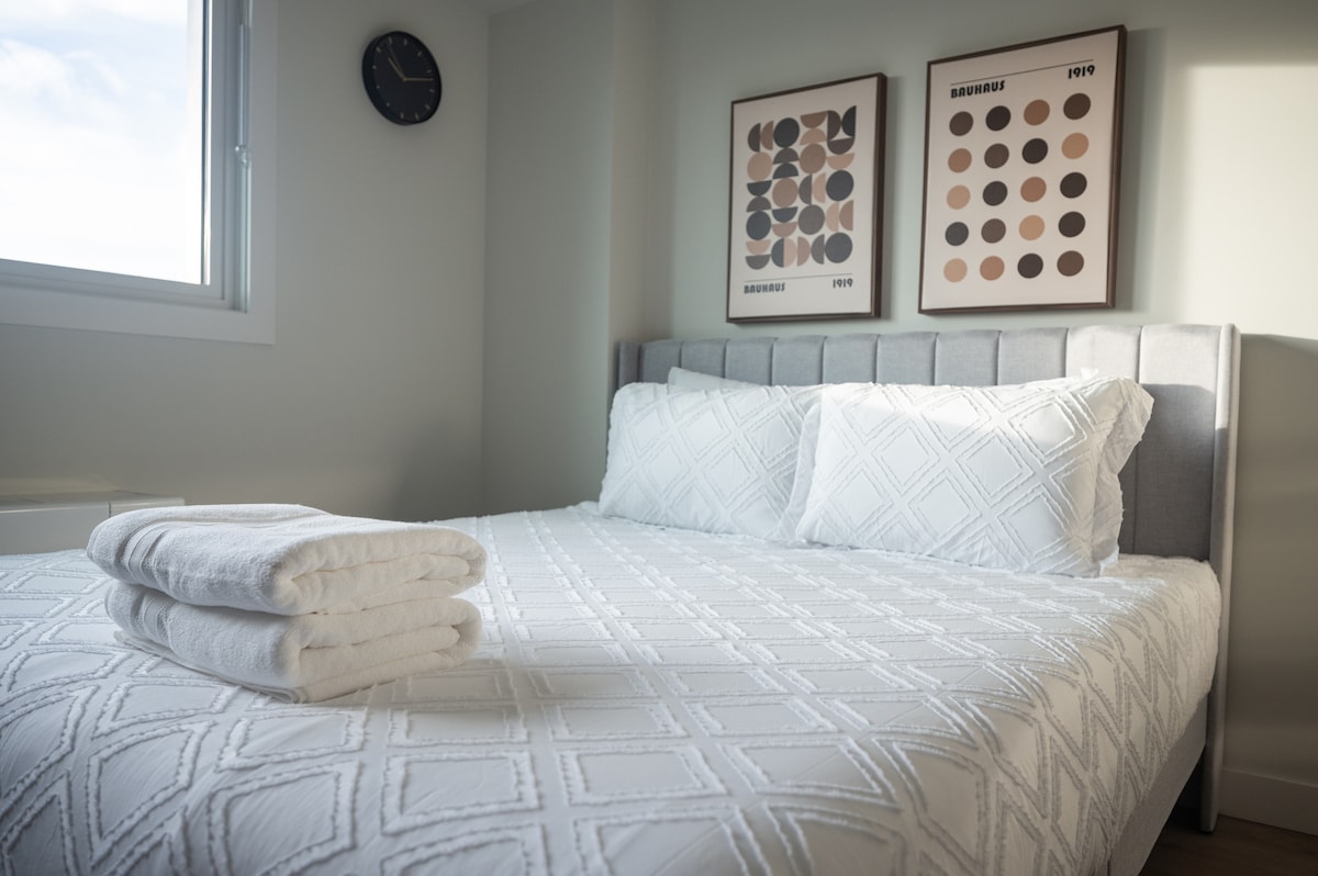 Cet appartement est situé au centre d'Edmonton et il est proche de tous les sites que vous voulez visiter. Très bel appartement qui respire le confort avec café, chocolat et thé à préparer soi-même gratuits. La chambre dispose d'un matelas ENDY Queen Size très confortable pour que vous puissiez passer une nuit bien reposée. L'appartement est - à distance de marche du stade du Commonwealth d'Edmonton. - à 3,1 km de Rogers Place ; - à quelques pas de l'arrêt de bus.