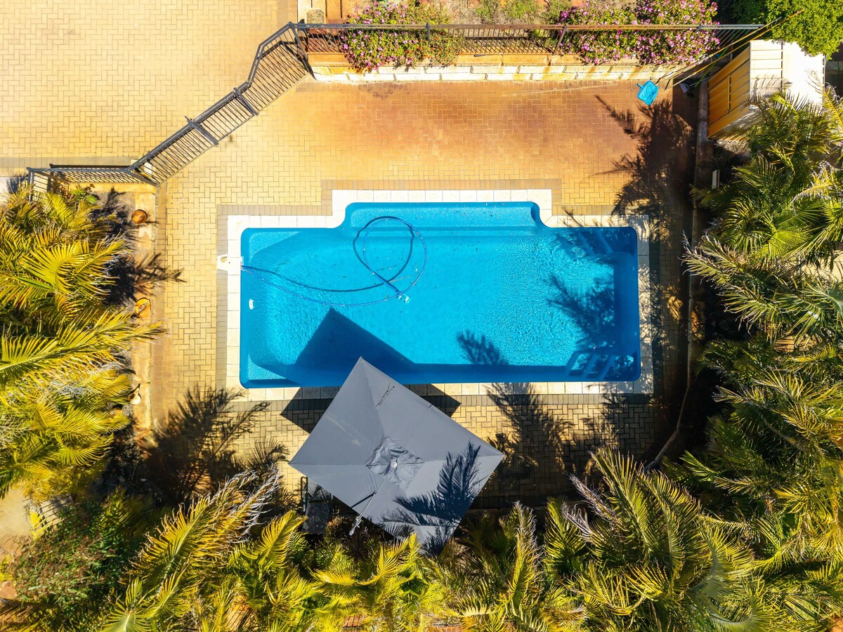Nouvelle villa funky de style Bali. Belle circulation extérieure intérieure lorsqu'elle est ouverte. Entrée sécurisée de la carte à digicode avec parking couvert hors rue. Piscine partagée (chauffée - 3 saisons hors hiver) disponible les heures de jour avec cascade. 2 chambres, téléviseurs dans toutes les pièces avec Netflix, Stan et Prime connectés, Bluetooth wifi Stereo, Aircons vers toutes les pièces, foyer intérieur, petite bibliothèque Nouvelle addition ! Toute nouvelle chambre Queen Deluxe « Chambre 3 - theroom » disponible en supplément
