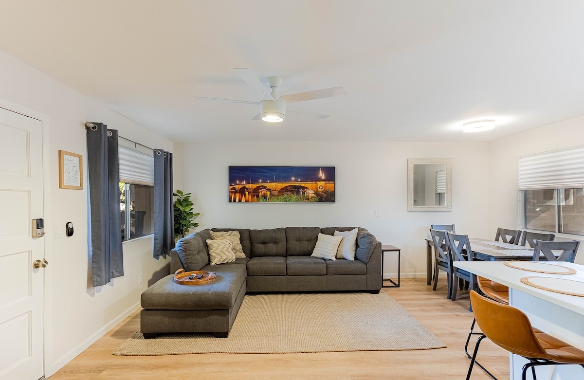 Villa entièrement meublée avec 1 chambre, 1 salle de bain, une cuisine complète, le Wi-Fi, un garage privé, un lave-linge, un sèche-linge et une piscine commune. Située dans un quartier calme, à seulement quelques minutes du centre-ville et du lac. Deux téléviseurs Roku avec centre de connexion et « mode invité » activé. 2800 Tonto Drive #103 50 $ de frais pour les animaux de compagnie par animal Arrivée anticipée ou départ tardif disponibles moyennant des frais supplémentaires. Taxe sur le privilège des transactions de l'Arizona n° 20168434