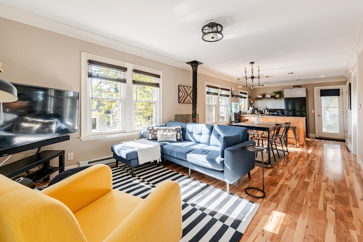 The Yellow • 1,750ft² (170m²), 2-level cottage • Open concept with 180° view from living room • 3 bedrooms (all queen size beds), 2 full baths • Fully equipped kitchen • Private dock & firepit (access via uneven steps) • Canoe & 2 kayaks • Smart TV & 4 Google smart speakers • 1 Gigabit Wi-Fi • Workspace with laptop stand upstairs • Additional full size bed upstairs • Additional queen size sofa bed downstairs • Additional twin trundle downstairs • Washer and dryer with laundry detergent