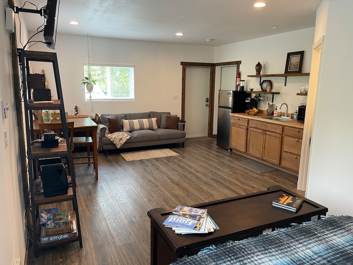 Quiet studio in town. Conventient location, Walking distance to Starbucks and groceries. Our studio has a spacious fully equipped kitchen and full bathroom with a tub. The private patio is one of our favorite features! Enjoy the beautiful views of the olympic mountains and colorful sunsets! We use all non-toxic plant based cleaning products & 'free&clear' laundry detergent to make your stay more comfortable. Aromatherapy with pure therapeutic grade essential oils to give a spa like experience!