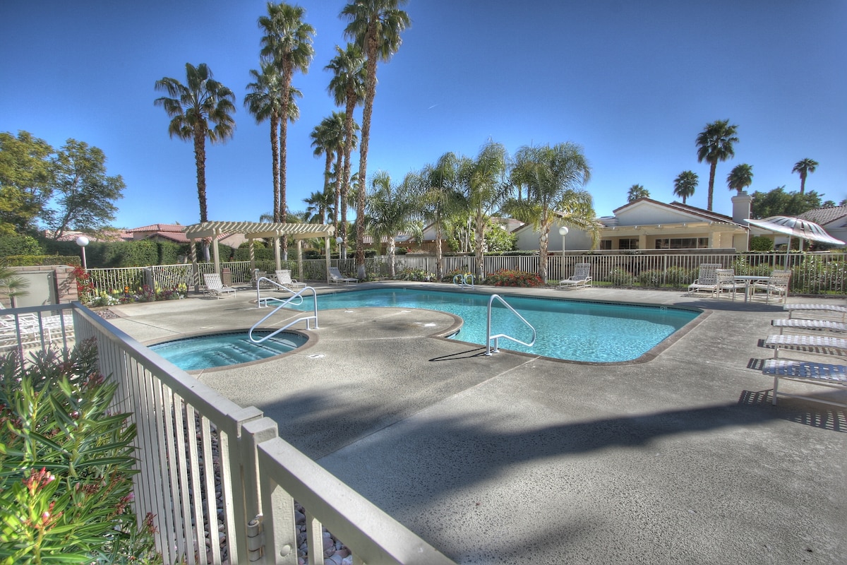Emplacement d'extrémité de plain-pied, vue sur le spa d'eau salée et la piscine et les montagnes , marches menant au terrain de golf / meilleur dans le désert club de pickleball/ 2 clubs avec restaurants et salons / tennis /balle de pétanque/ practice . Le condo dispose d'un double garage attenant, lave-linge, wifi, radeaux de piscine, vélos, environ 850 pieds carrés, îlot barbecue, télévision par câble (nouvelle télévision Samsung 75" SMART tv qled 4K), portail gardé, un lit king size, cuisine et salle de bain entièrement équipées, patio carrelé prolongé avec auvent et dressing.