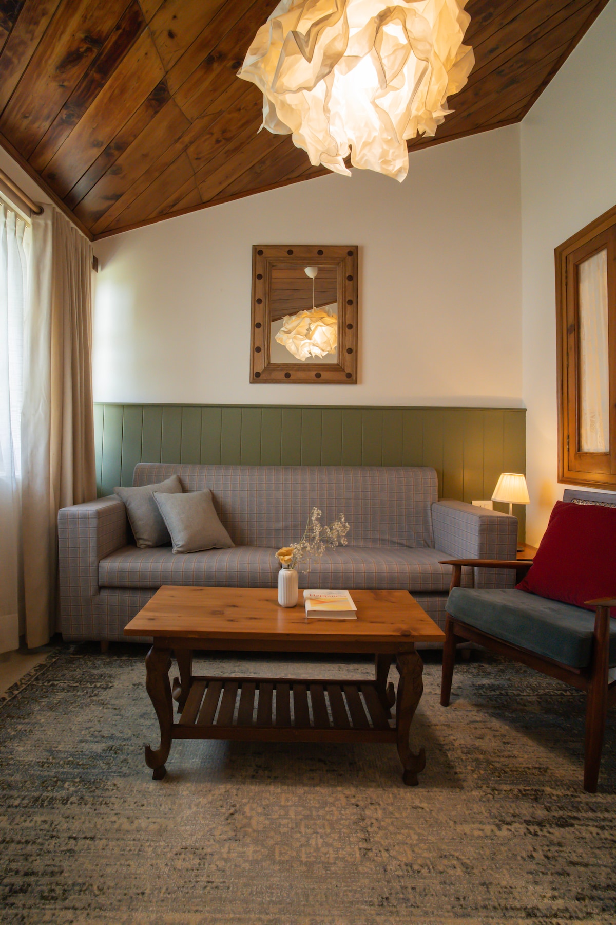Enjoy a memorable visit when you stay in this unique place. Herne Lodge is a 200 years old estate, with a main colonial building and a newly renovated wing housing this apartment. The apartment commands a panoramic view of the inner Himalayan range, and overlooks the Yamuna-Aghlad river valley. The snow clad Bandar Poonchh range is also visible in the distance, behind well known peaks like the Nag Tibba. This kind of panoramic view is very rare in our region.