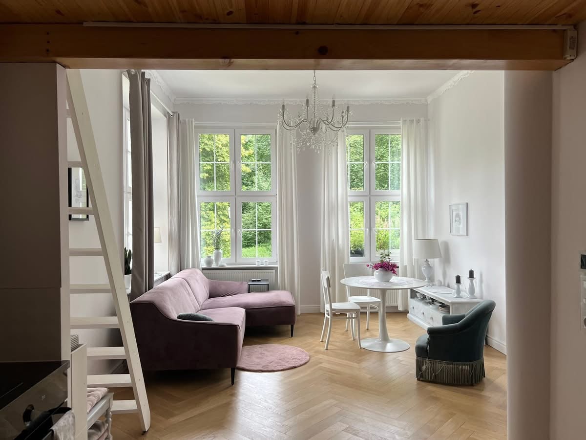 Loin de l'agitation de la ville et du cri de « civilisation ». Un logement avec une âme et un passé. Près de la mer Baltique, littéralement au bout de la route, où il y a une vue sur la forêt et le chant des oiseaux. Petit déjeuner sur le porche du palais surplombant plus d'une centaine de parcs d'été. L'intérieur, où la modernité se combine avec les classiques. La puissance des vieux murs et le pouvoir de la nature à portée de main. Un palais à Lubiechów. Je vous invite dans un endroit où l'histoire et la nature embrassent tout son pouvoir ancien.