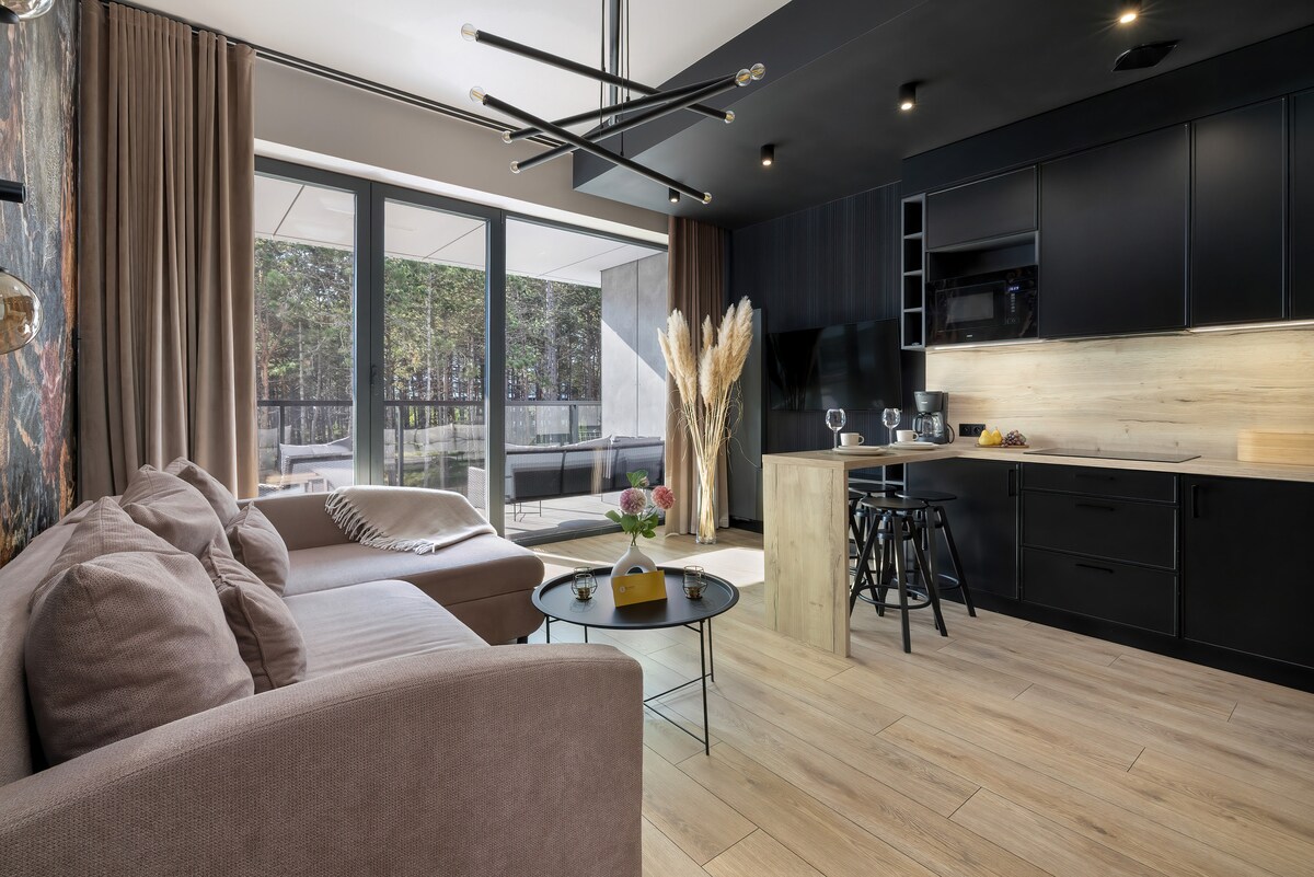✔ Modern apartment in seaside Rogowo ✔ Living room with a double sofa bed & bedroom with a double bed ✔ Free toiletries, towels, and bed linen ✔ Perfect choice for business or leisure stays ✔ Balcony with views of the forested neighborhood ✔ Parking space outside ✔ Contactless check-in and check-out ✔ VAT invoice available upon request ✔ Spa & Wellness: 2 pools, sauna & jacuzzi – additional fee payable on-site