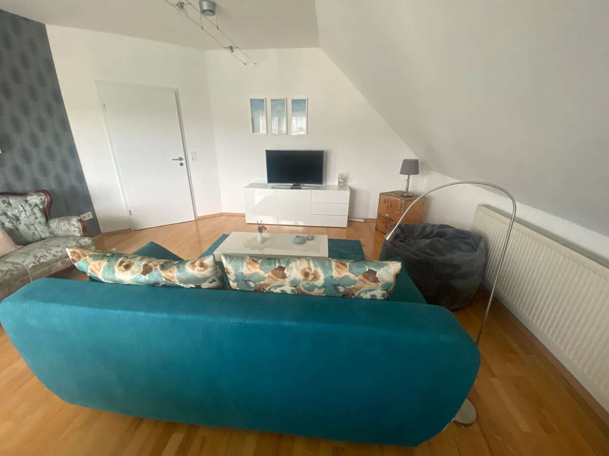 L'appartement de vacances est situé dans le grenier récemment rénové en 2023/24 d'une grande maison classée (après un grand incendie en 2022 dans la maison, tout a été rénové à partir de zéro). Il est bien équipé, confortable et offre beaucoup d'espace pour les familles avec enfants. Le WLAN, la télévision et un coin jeux font partie de l'équipement. Il y a aussi une cuisine entièrement équipée et une salle de bain avec douche et WC. Les chiens peuvent être amenés, il y a deux chats dans la maison : Mimi et Sally.