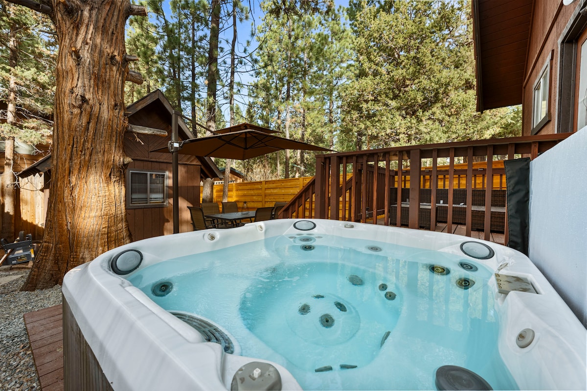 PERMIS MAX : 7 PERSONNES ET DEUX VOITURES. EMPLACEMENT, EMPLACEMENT, EMPLACEMENT !! Le Bear Necessities est un chalet familial acceptant les chiens, situé au centre, sur un terrain plat d'environ 1/3 acre avec beaucoup de grands arbres, terrasse, jacuzzi Caldera pour 7 personnes, cour arrière entièrement clôturée, grande pièce de 720 pieds carrés, cuisine ouverte, salle de jeux (entrée séparée), 2 chambres, 2 salles de bain et canapé-lit. À moins de 5 minutes de Snow Summit, Bear Mountain, du lac, du zoo, du terrain de golf et du mini-golf, des épiceries, des restaurants, de la randonnée.