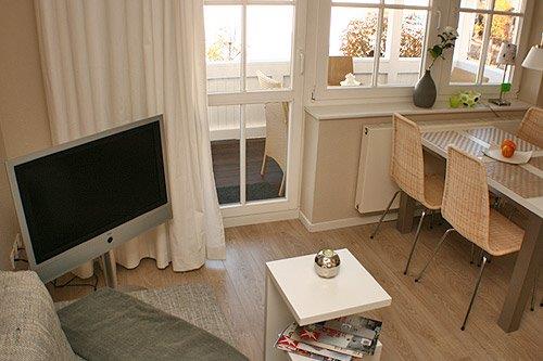 Appartement moderne de 2 pièces et demie avec chambre en tour et balcon (env. 70 m²) au dernier étage du parc résidentiel Granitz. L'appartement moderne de 2 pièces et demie Appartement Sandschloss (max. 4 personnes) dans le parc résidentiel Granitz est situé dans un emplacement central de Binz - à seulement 150 mètres de la plage et du centre. Salon et salle à manger salon lumineux Salle à manger et salon avec un canapé-lit Cuisine moderne équipée entre autres d'un lave-vaisselle, d'un four/micro-ondes combiné, d'une cuisinière à induction,