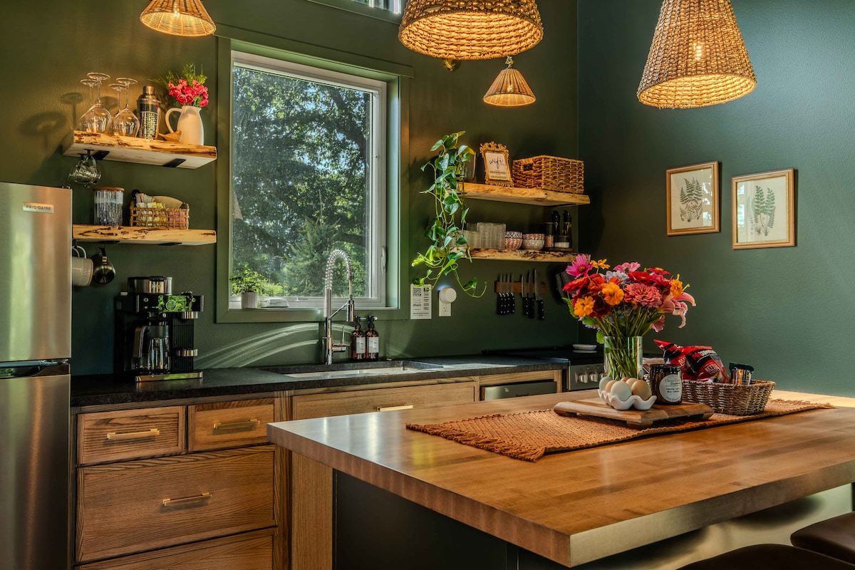 Détendez-vous dans ce logement calme et élégant. Niché parmi les arbres, il offre une escapade tranquille loin du chaos de la vie, vous permettant de vous ressourcer et de vous renouveler. La résidence principale est à environ 400 pieds de la cabane. La cabane est isolée et pourtant proche des attractions locales, des restaurants, des pistes cyclables et des sentiers naturels. Le chalet dispose d'un total de 420 pieds carrés d'espace de vie avec 280 pieds carrés au rez-de-chaussée et un loft de 140 pieds carrés.