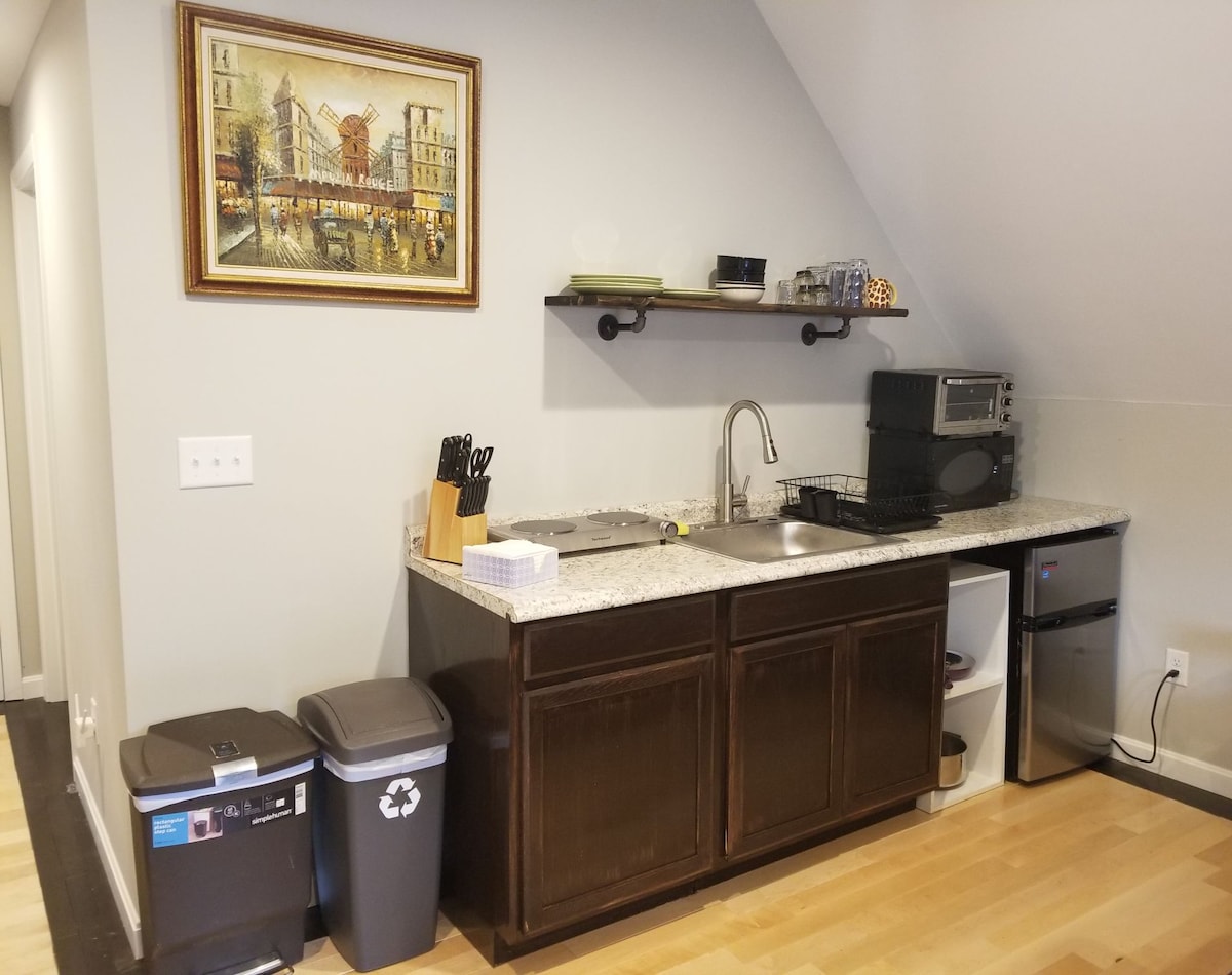 Appartement mansardé privé récemment rénové près du centre-ville d'Hudson avec kitchenette, salon et chambre/bureau. Un espace chaleureux et confortable avec beaucoup de lumière naturelle ! Tout juste aménagé avec un nouveau lit King Size ! Parking gratuit sur place À distance de marche des restaurants, des nettoyeurs, des antiquaires, du roller, du centre commercial, de la salle de sport, des brasseries, du terrain de golf... et bien plus encore ! À proximité, il y a beaucoup de sites historiques, de domaines skiables et de zones de baignade !