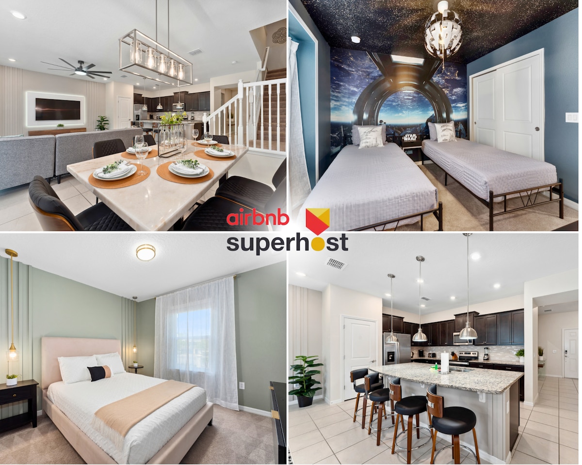 Conçu professionnellement pour des vacances inoubliables et SANS TRACAS ! ☆ PARC AQUATIQUE SUR PLACE SALLE DE JEUX à☆ thème avec ARCADE et salon de jeux haut de gamme Lits ☆ ultra confortables. Peut accueillir jusqu'à 12 personnes Chambre Vaiana☆ sur mesure ☆ 2 suites de luxe avec lit King Size et 1 suite Queen Draps ☆ de luxe PISCINE ☆ privée chauffée BAR À CAFÉ☆ entièrement approvisionné ☆ Cuisine entièrement équipée avec ustensiles de cuisine, vaisselle avec extras ☆ Machine à pop-corn ☆ À quelques minutes de Disney World et Universal Studios. ☆ Adapté aux familles
