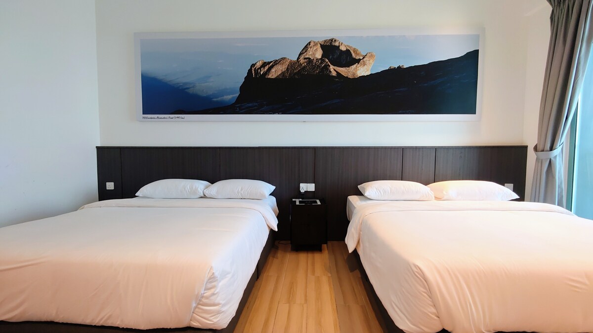 Master bedroom with a separate living room and a balcony with a calming mountain view. Located at a 4-star Hotel at Gaya Street, the central spot of Kota Kinabalu, within 3-minute walking distance to Suria Sabah, Jesselton Quay, night markets, and Sunday market, numerous must-visit top local restaurants such as Shoney's, Merah Merah Korea, and On 22, also equipped with a swimming pool with a sea view, this will be a perfect place for you.