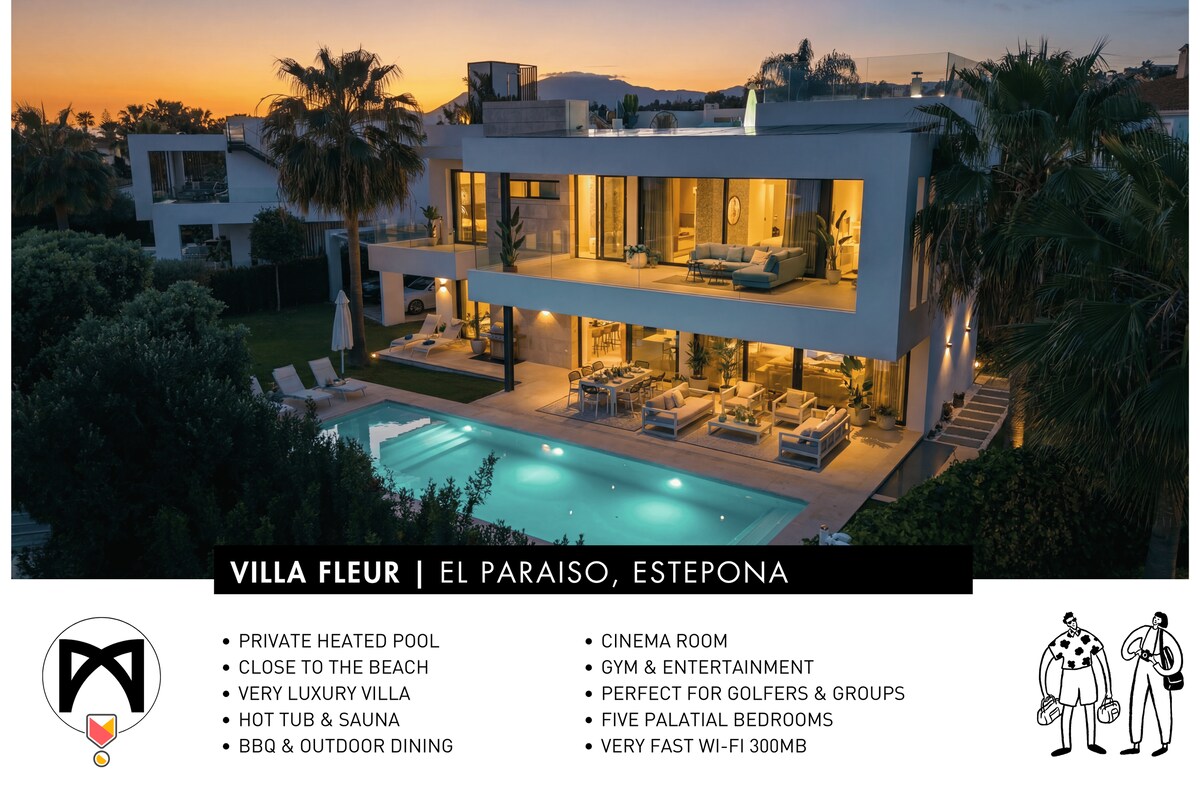 Nouvelle maison unique dans un emplacement privilégié. Piscine super chauffée. Design, matériaux nobles. Golf en première ligne, vue sur la mer en première ligne de l'entrée du port d'Estepona. La Cosy Cosita est une villa indépendante, construite à une certaine hauteur, ouverte sur la piscine et le jardin, au milieu de la nature. À 5 minutes du port d'Estepona et de la plage. Depuis la terrasse sur le toit : panorama à 360 degrés sur le parcours de golf, la baie d'Estepona et la magnifique chaîne de montagnes de la Sierra Bermeja. Un parcours de golf 18 trous à 500 m, un à 1 km et un à 3 km.
