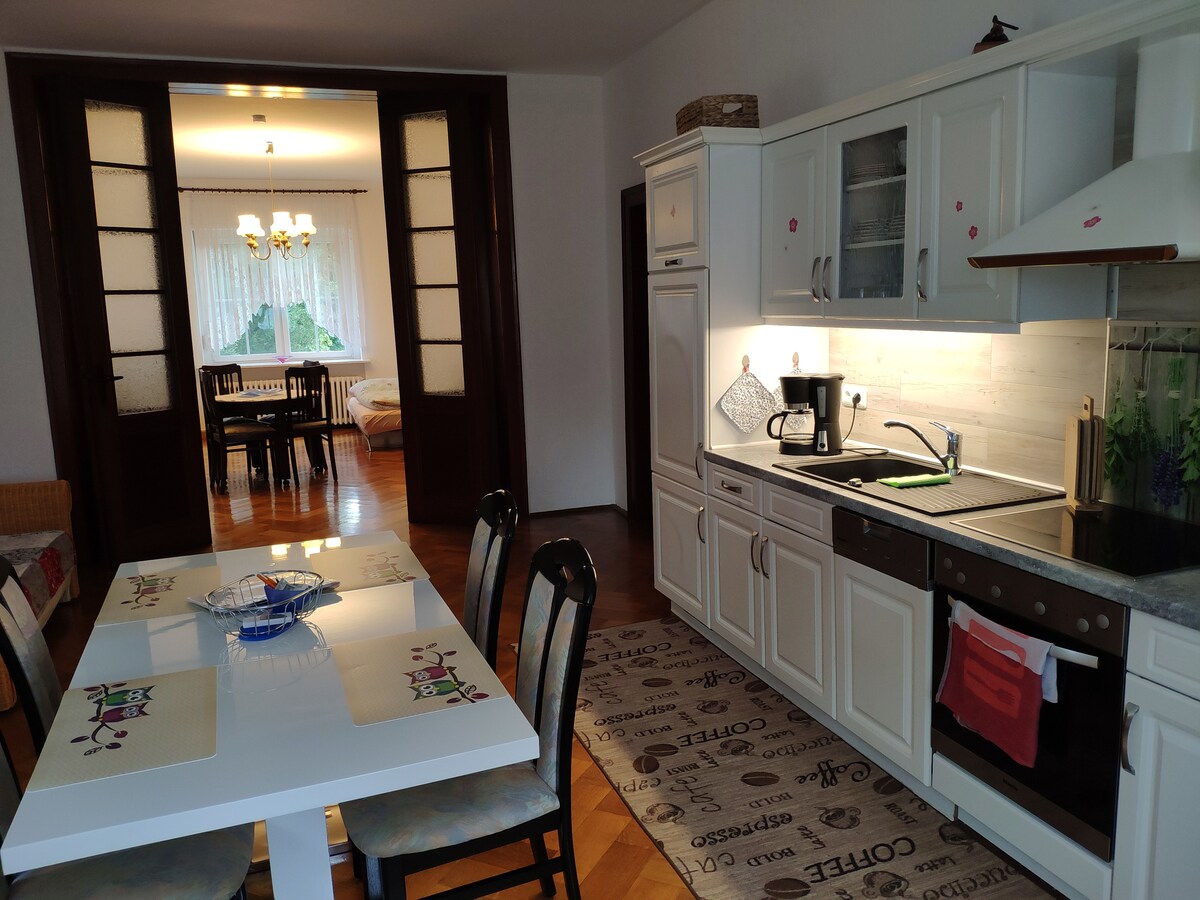 L'appartement a env. 80 m² et est situé dans un endroit pratique, confortable et calme à Leipzig- Mölkau. L'appartement est entièrement rénové et décoré avec des meubles de haute qualité. Composé d'un salon avec canapé-lit, véranda avec lit de voyage pour enfants, chambre avec lit double, une cuisine entièrement équipée avec réfrigérateur/congélateur, lave-vaisselle, cuisinière avec four, machine à café, grille-pain, bouilloire. Salle de bain avec douche accessible. Partie de jardin avec coin salon.