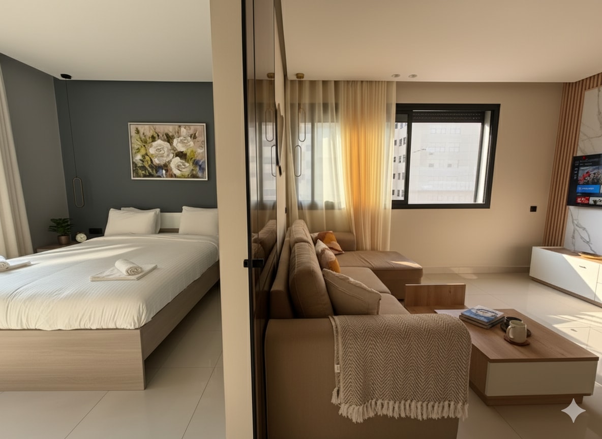 ✨ Profitez de notre studio moderne, confortable et luxueux, idéal pour les couples 💑, les amis 👭 ou les voyageurs en déplacement professionnel. 🌟 Emplacement Idéal : Studio romantique au cœur de Bourgogne Casablanca, proche des Mosquée Hassan 2 ,Marina , Saqala , Marjane… 🛋 Espace Confortable : Salon lumineux avec patio, cuisine américaine équipée, chambre avec Belle terrasse. ❤️ Parfait pour les Couples : Séjour intime et cosy , Wi-Fi rapide et climatisation, idéal pour moments 💕