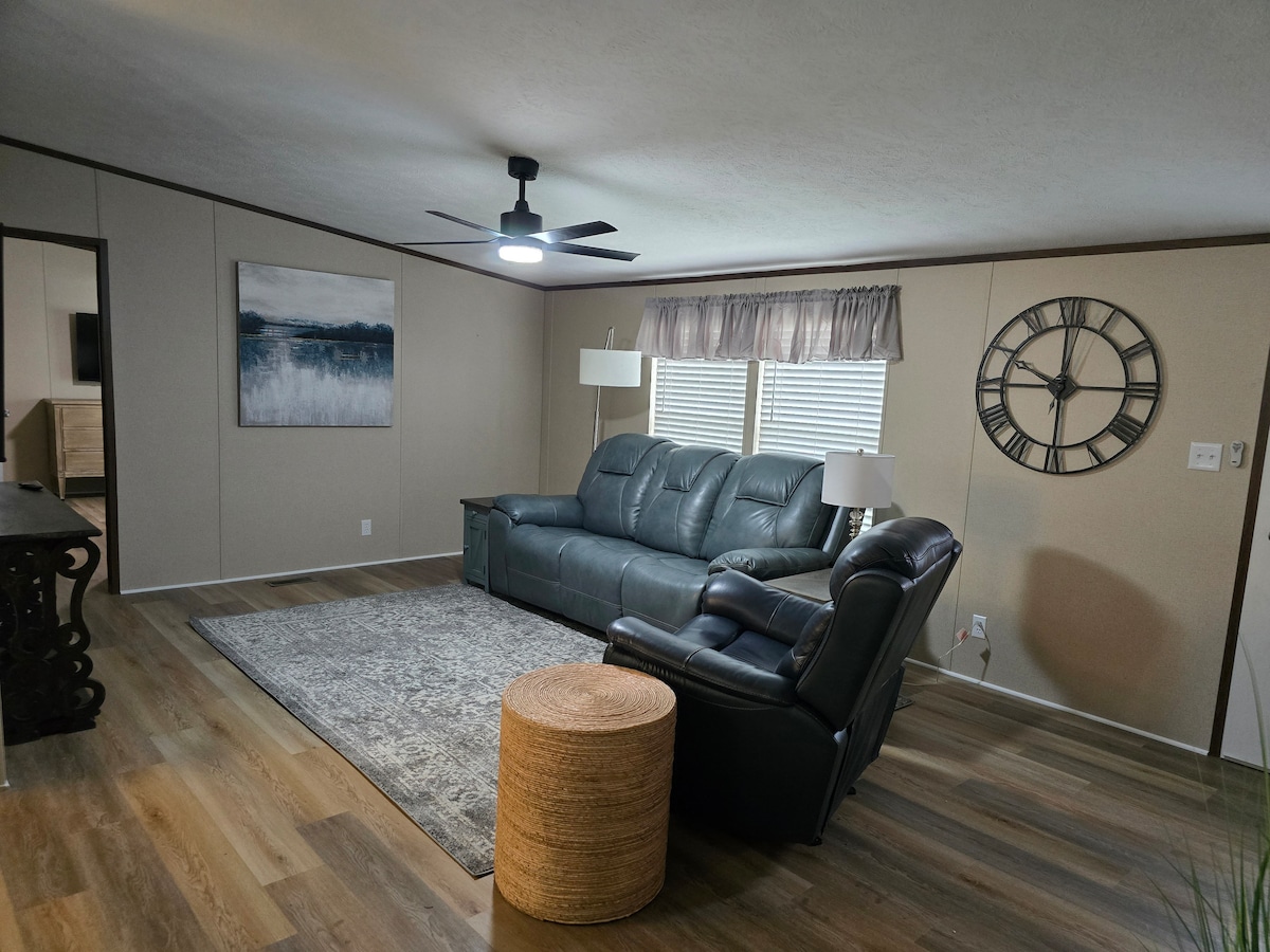 Maison spacieuse de 4 chambres et 2 salles de bain au bord du lac, idéale pour les familles ou les groupes. Profitez d'un accès direct au lac avec une rampe de mise à l'eau et des amarres communautaires, un nouveau quai, la pêche, un foyer, un gril et une cuisine complète avec lave-vaisselle. Comprend la climatisation centrale, lave-linge/sèche-linge, Wi-Fi, grande télévision et parking dans l'allée. 9 couchages avec 1 lit king size, 2 lits queen size, 3 lits jumeaux. Espace de travail dédié disponible. Idéal pour des escapades relaxantes avec des activités nautiques et des nuits confortables au bord du lac.