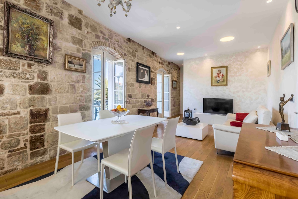 Beauté de pierre de 1467, monument culturel situé dans le cœur historique de Pučišća - l'une des 15 plus belles petites villes d'Europe. Le château médiéval restauré vous offrira des moments de paix et de tranquillité car la façade du château fait face à la mer et à la ville et derrière il y a un jardin, une cour et trois terrasses pour des moments de repos. L'appartement au premier étage se compose d'une salle à manger et d'un salon, d'une cuisine, d'une salle de bains et d'une chambre avec vue sur un jardin.