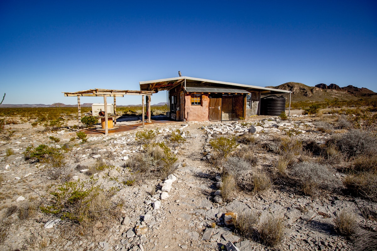 Experience sunrises, sunsets and silence! No tv! An authentic, one room, earthen “cob house” on 300 private acres, totally off grid, solar powered, with rainwater catchment. Hot outdoor showers under the stars, rock patios, gas stove, mini fridge, king size bed, covered parking, WiFi, fire pit and Tootsie the turtle lives here too! Linens, kitchen utensils and towels provided. Only 30 minutes to Big Bend National Park and Terlingua Ghost town, 20 min to Terlingua Ranch Pool and Bad Rabbit Cafe.