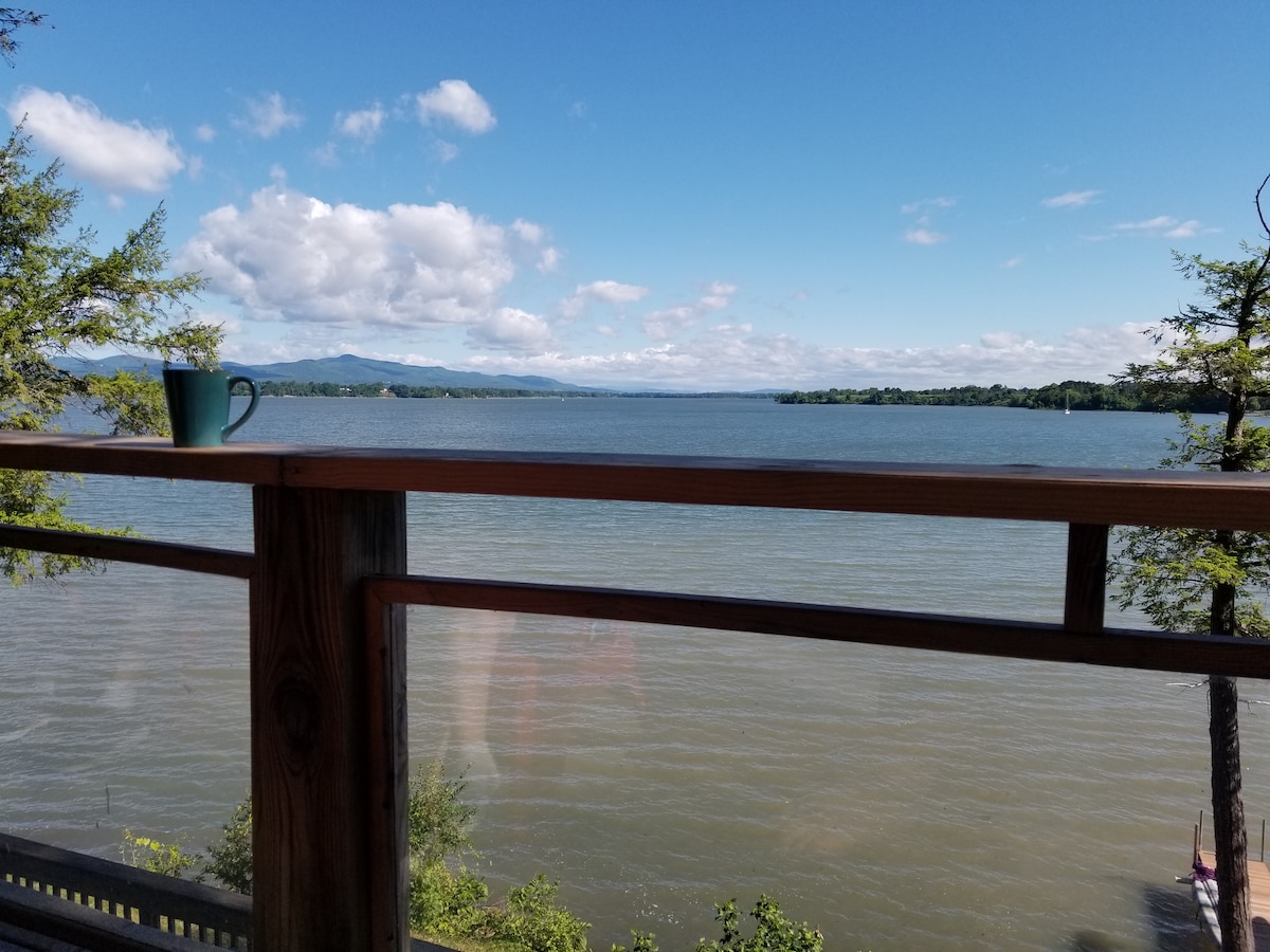 Cette maison en bord de lac en bois toute l'année est située sur une route privée sans issue avec une vue imprenable sur le lac Champlain, le pont Crown Point et les montagnes Adirondack. Il peut facilement accueillir 8 personnes et plus, il est donc parfait pour les familles, les grands groupes et les amis à quatre pattes bien élevés. Il y a trois chambres avec des rois de Californie plus un canapé-lit queen size dans le salon séparé. Il y a des vues pittoresques des 3 niveaux pour profiter des couchers de soleil, des levers de soleil et du pygargue à tête blanche résidente.