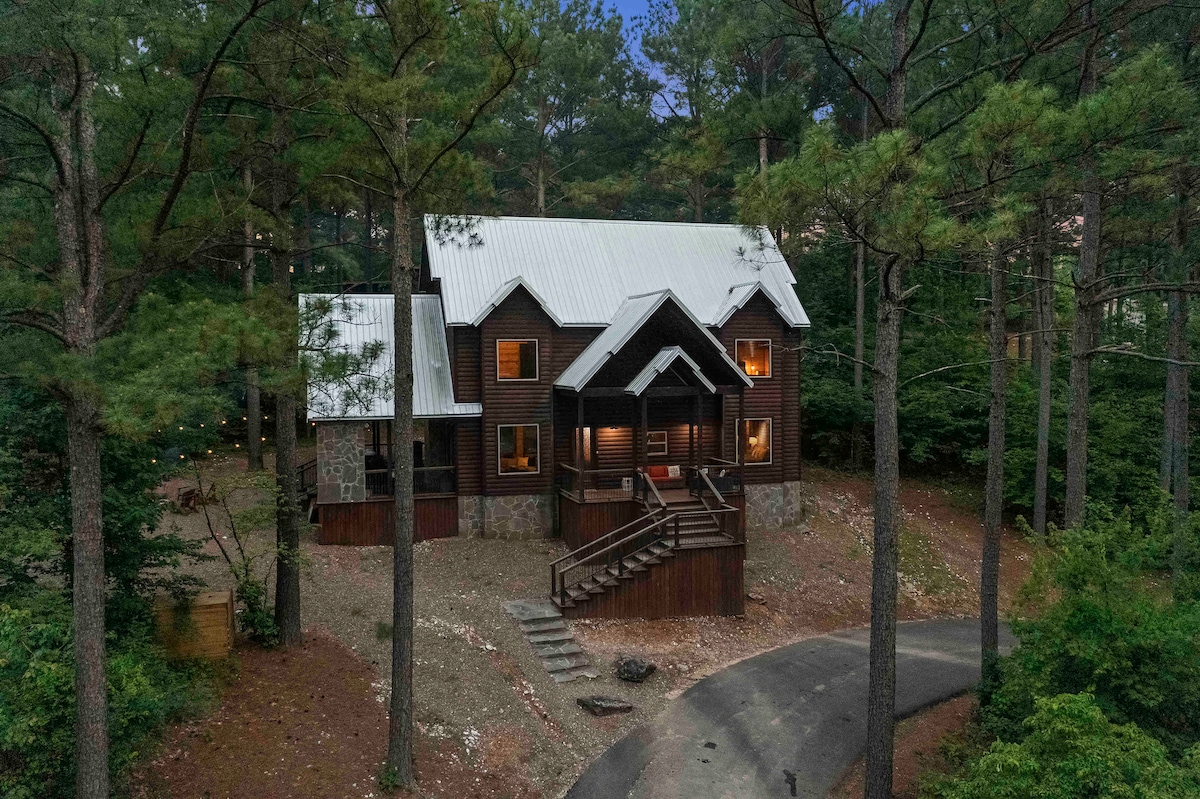 Détendez-vous à l'État de l'art, un joyau de 6 lits, 5,5 salles de bain et 3 étages de Hochatown au charme rustique du milieu du siècle. Pensez au jacuzzi, au brasero, aux barbecues, au baby-foot, à l'arcade et au jeu, ainsi qu'aux téléviseurs intelligents et au Wi-Fi rapide. Les chiens sont les bienvenus (50 $ supplémentaires/nuit, max. 2). Spacieux avec cheminées, immenses fenêtres, douches de luxe et balcons par chambre king size. Un séjour hors pair : réservez votre aventure dès aujourd'hui ! Idéal pour les familles ou les groupes, il est proche de Beavers Bend. Attendez-vous à des nuits confortables, des vues épiques et des souvenirs à profusion !