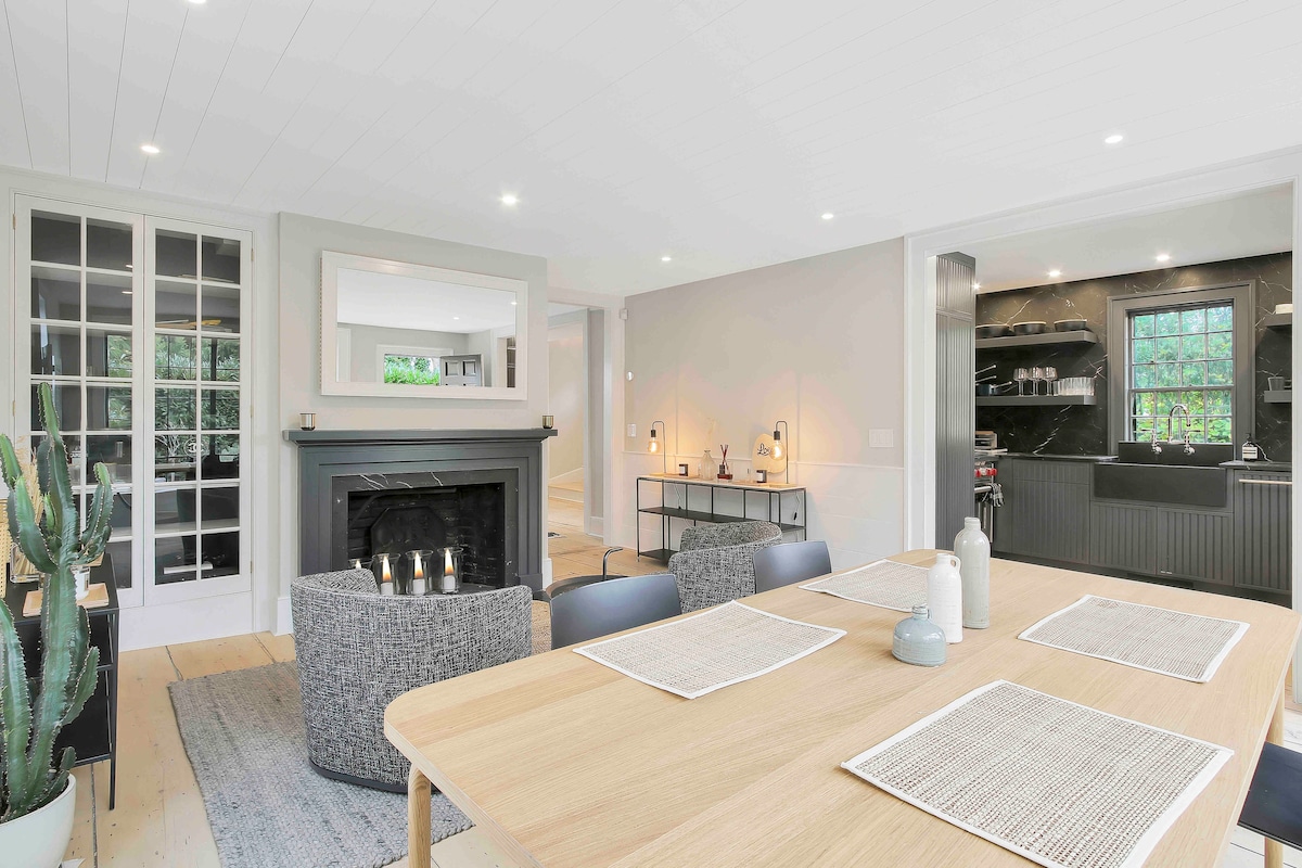 Évadez-vous et détendez-vous dans cette belle retraite tranquille de Southampton ! Chalet récemment rénové à quelques pâtés de maisons de l'eau. La maison est nichée sur un terrain calme de 1/2 acre semblable à un parc situé au bout d'une longue allée de gravier. Profitez de l'espace extérieur privé avec un foyer, une table à manger extérieure, un nouveau double barbecue et des chaises longues. À l'intérieur, la grande table de la salle à manger peut facilement accueillir 8 personnes. Cette élégante ferme côtière dispose de lits et de meubles neufs. Complet avec Wi-Fi, câble, climatisation et machine à café Nespresso !