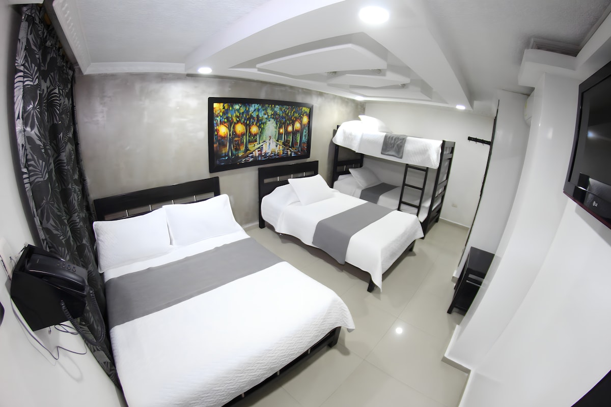 Coliving inspiré de Santorin et de la grandeur d'Alexandre le Grand. Les espaces blancs, les touches bleues et le design industriel créent une atmosphère unique. Chambre privée jusqu'à 6 personnes 3 lits doubles, salle de bain privée, Smart TV, bureau, placard, ventilateur… Espaces communs, terrasse bar, salle de sport, cafétéria, « Petit déjeuner inclus ». Nous sommes dans le meilleur quartier de Bucaramanga, à proximité de tout... Ici, vous ne vous contentez pas de séjourner... vous partez à la conquête. Vivez avec honneur. Vivez Alexandrie. CHAMBRE X INDO