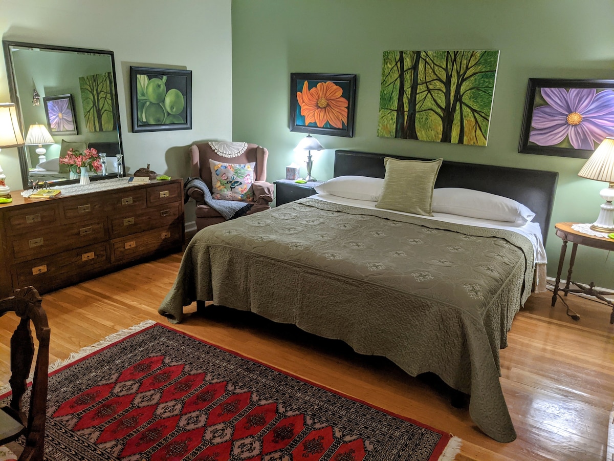La salle verte propre dispose d'un lit KingSize confortable et d'une salle de bain privée. Situé dans un beau quartier résidentiel calme de Doylestown, cette maison chaleureuse et confortable est à seulement 2 miles du centre de la ville. Grand, spacieux, planchers de bois franc, léger et aéré, cet espace vous fera sentir comme à la maison pour une bonne nuit de repos. Profitez d'un petit-déjeuner complet, ainsi que de l'accès à la cuisine et au patio arrière. Pour les longs séjours, une buanderie est disponible. Parking disponible dans l'allée, à l'abri de tout trafic de passage.