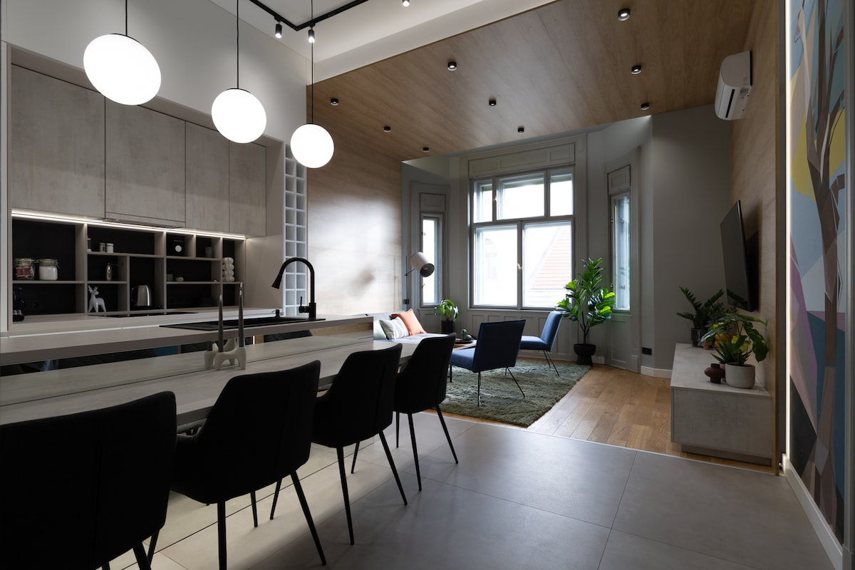 Luxury 2-Bedroom, 2-Bathroom Apartment in Central Budapest Stylish apartment with premium furniture, spacious living room, dining area, fully equipped kitchen, and high-speed internet. Surrounded by top restaurants, cafes, and bars — the perfect base to enjoy the city. 🐾 Pets welcome: one dog only, €30 pet fee. 🅿️ Private garage parking 150m from the apartment. Complimentary access to a partner Spa & Gym (600m away) for bookings over €150/night. 🛗 2nd floor with elevator