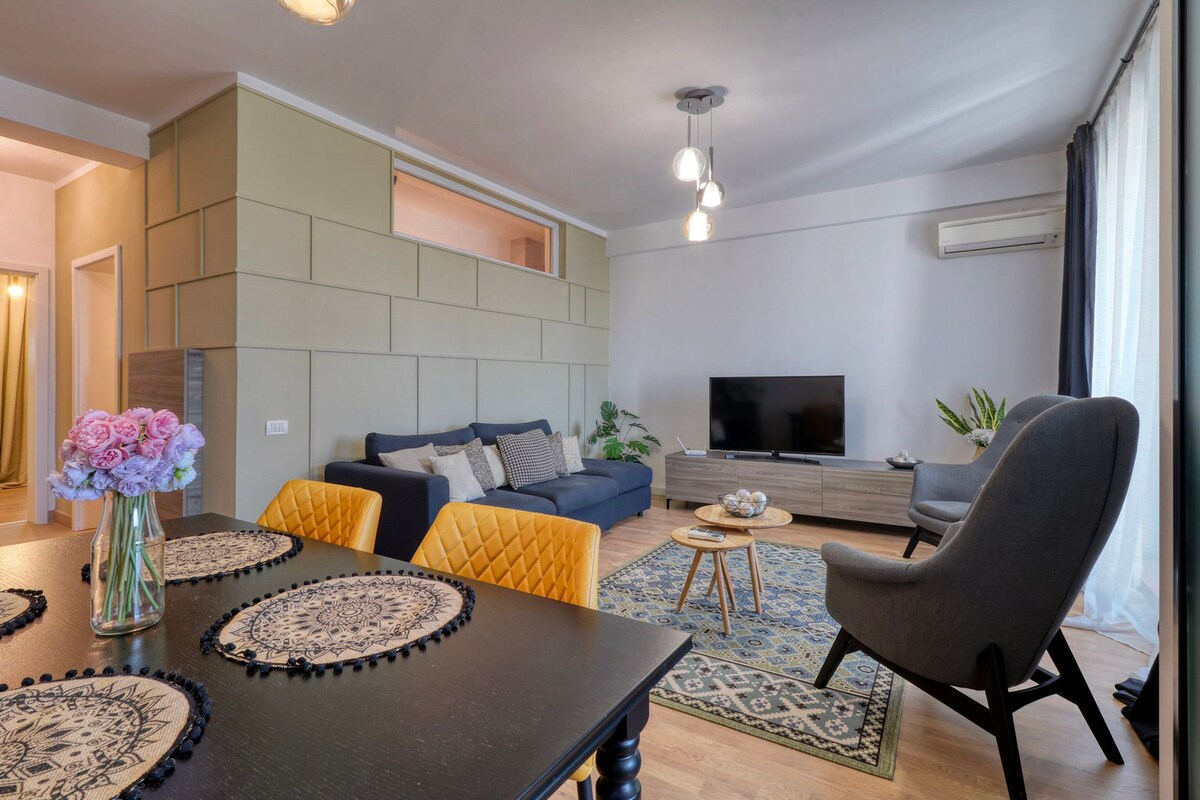 Profitez d'une expérience élégante dans ce logement central de la résidence Militari. Cet appartement comporte ce qui suit : Parking privé avec barrière Murs décorés avec Stucco Veneziano Télévision intelligente 4K avec Netflix. Climatisation Le complexe dispose de : piscine intérieure et extérieure, sauna humide et sec, jacuzzi, salle de sport. La distance de Welness est de 500 m, et de l'Aqua Garden à 550 m, à environ 7 minutes à pied. Le prix pour l'accès à la piscine est de 75 Ron/ personne