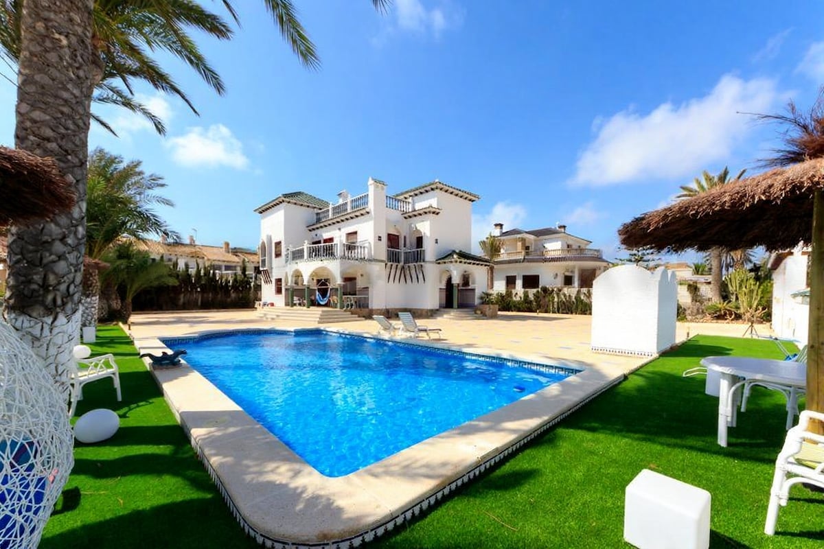 Magnifique villa avec vue sur la mer Méditerranée, à seulement 50 mètres de la plage. Grand terrain avec piscine de 32 m2, cuisine extérieure et barbecue et grand terrain de golf artificiel, afin que vous puissiez jouer au golf dans le jardin. La maison peut accueillir jusqu' à 4 adultes et 2 enfants avec 3 salles de bain et une cuisine/salle de séjour commune. Il a plusieurs terrasses dans toutes les directions fournissant le soleil ou l'ombre que vous préférez. Parking extérieur sur le terrain. Bars/restaurants juste à côté. Shopping à quelques minutes en voiture.