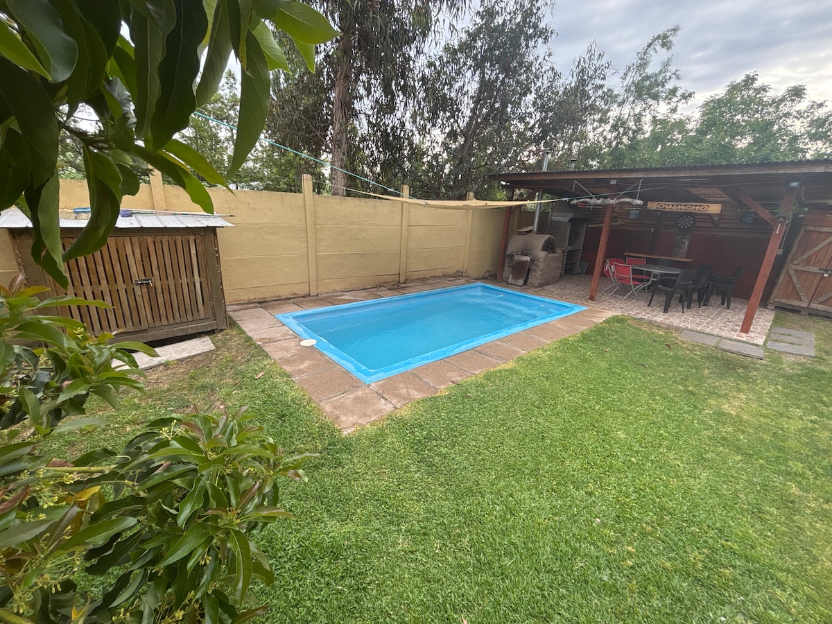 Te damos la bienvenida a nuestra linda casa de campo Happy Alpacas a los pies del cerro el Challay, es una casa completa en un lugar privado ideal para relajarse y disfrutar en familia. Quincho amplio con parrilla a carbón, tinaja a leña para 7 personas, bar, piscina, tacataca. se entrega con sabanas y ropa de cama. Ubicada muy cerca del Casino Monticello