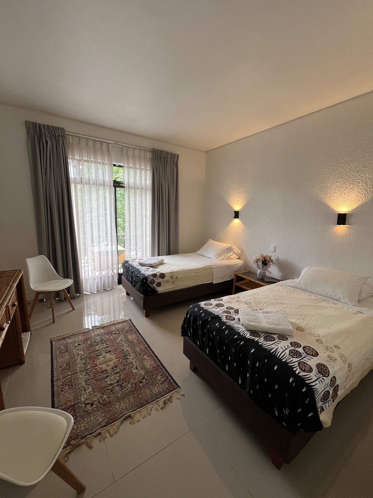 Combio de 2 habitaciones: 1 habitacion con 2 camas single + 1 habitacion con cama matrimonial + desayuno + baño compartido. Este alojamiento te ofrece una conexión profunda con la naturaleza y muchas actividades para disfrutar sin tecnología. Espacios en comun: -Sala de juegos (para niños y adultos) - Sala de musica (TV compartido) - Comedor (Abierto a todas restric. Alimentarias) - Zona de trabajo (Wifi) - Gym - pileta - Quinta -Cancha de tenis y futbol