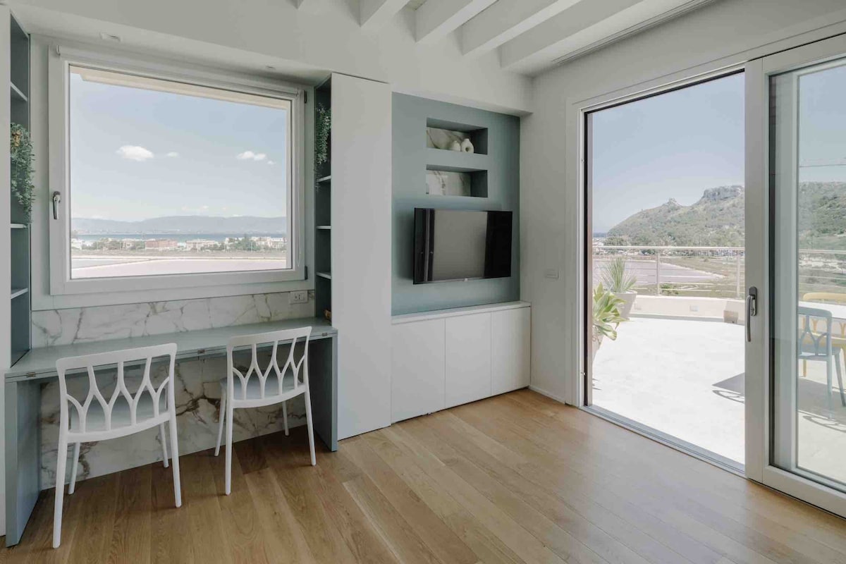 Appartement penthouse moderne et magnifiquement meublé offrant une vue imprenable sur la réserve naturelle de Molentalgius, la Sella del Diavolo et la belle plage de Poetto, à seulement cinq minutes à pied de l'appartement, où vous trouverez une abondance de restaurants et d'établissements de plage. L'entrée de la réserve d'eau où vous pourrez admirer les flamants roses de Cagliari est également accessible à pied Super emplacement résidentiel stratégique et calme près de la plage, loin du chaos mais avec toutes les commodités à proximité.