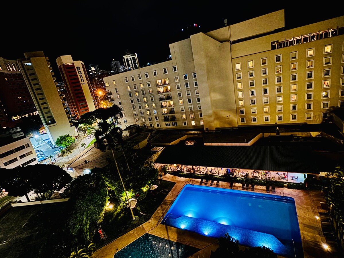 Appartement au 8e étage, avec un balcon incroyable et vue sur Cali. L'appartement se compose de : chambre principale avec lit king size, salle de bain privée et dressing. Chambre auxiliaire avec 2 lits simples (pouvant être réunis) et climatisation. Service WIFI de 300 mégaoctets. Cuisine très bien équipée, salle de bain complète, salon, salle à manger et 2 smart TV avec accès à Netflix Le bâtiment dispose d'une sécurité privée 24h/24 et 7j/7, de deux ascenseurs, d'un garage couvert, d'une salle de sport, d'une laverie, d'un espace de coworking et d'une piscine.