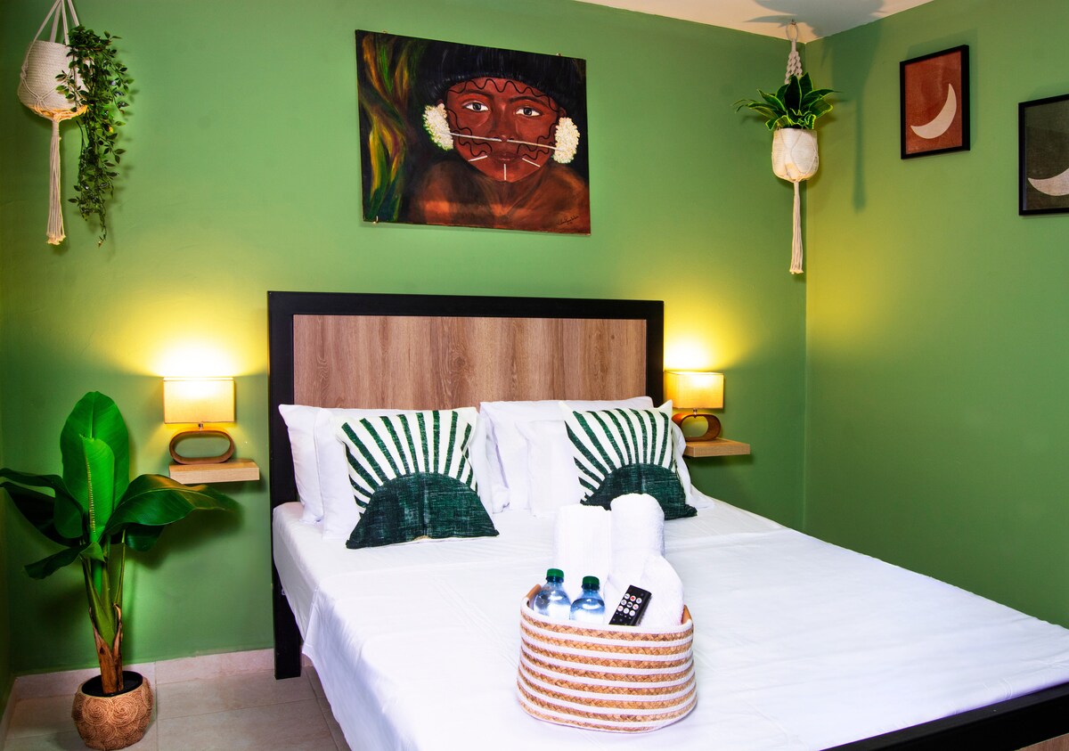 Séjournez dans notre chambre Bohio Queen avec salle de bain privée et douche chaude. Profitez d'une télévision connectée avec Netflix, de votre propre mini-réfrigérateur et de la climatisation pour plus de confort. Design confortable, linge de maison haut de gamme et accès à tous les espaces partagés : coworking, cuisine, terrasse, salon et réception 24 h/24 et 7 j/7.