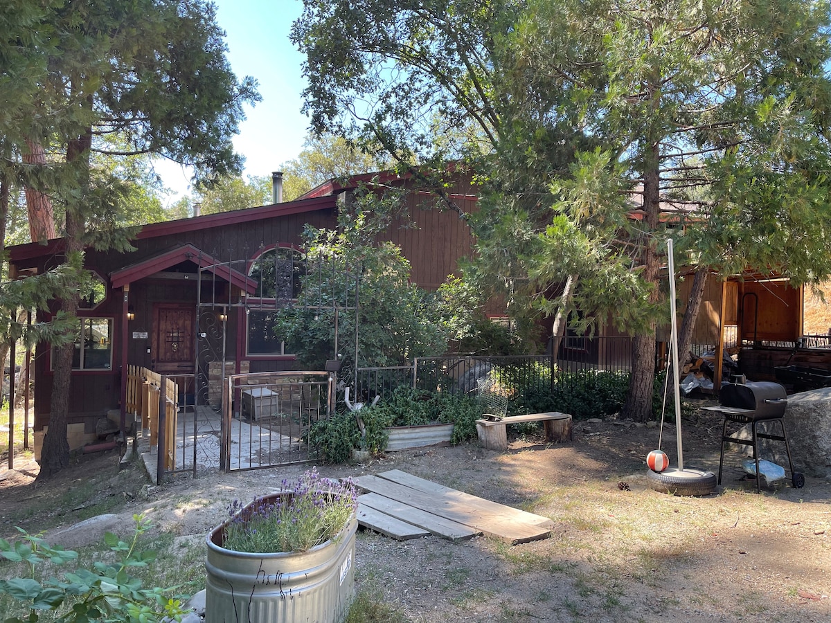 Détendez-vous et communiez dans notre cabane de conte de fées tranquille. Nous sommes dans la forêt nationale de Sequoia, pas dans le parc, pour info. 2 chambres et une salle de bain complète à l'étage, 1 chambre et une salle de bain complète en bas. Un petit poêle à gaz complète le chauffage central Nest, le gardant au chaud même lorsque la neige s'accumule. Nous sommes sur un demi-acre avec une belle prairie à quelques pas du porche arrière. Un jacuzzi au feu de bois à côté de l'anneau de feu offre un bain relaxant. Nous sommes Ponderosa, le plus doux des secrets de Californie. Cert #490
